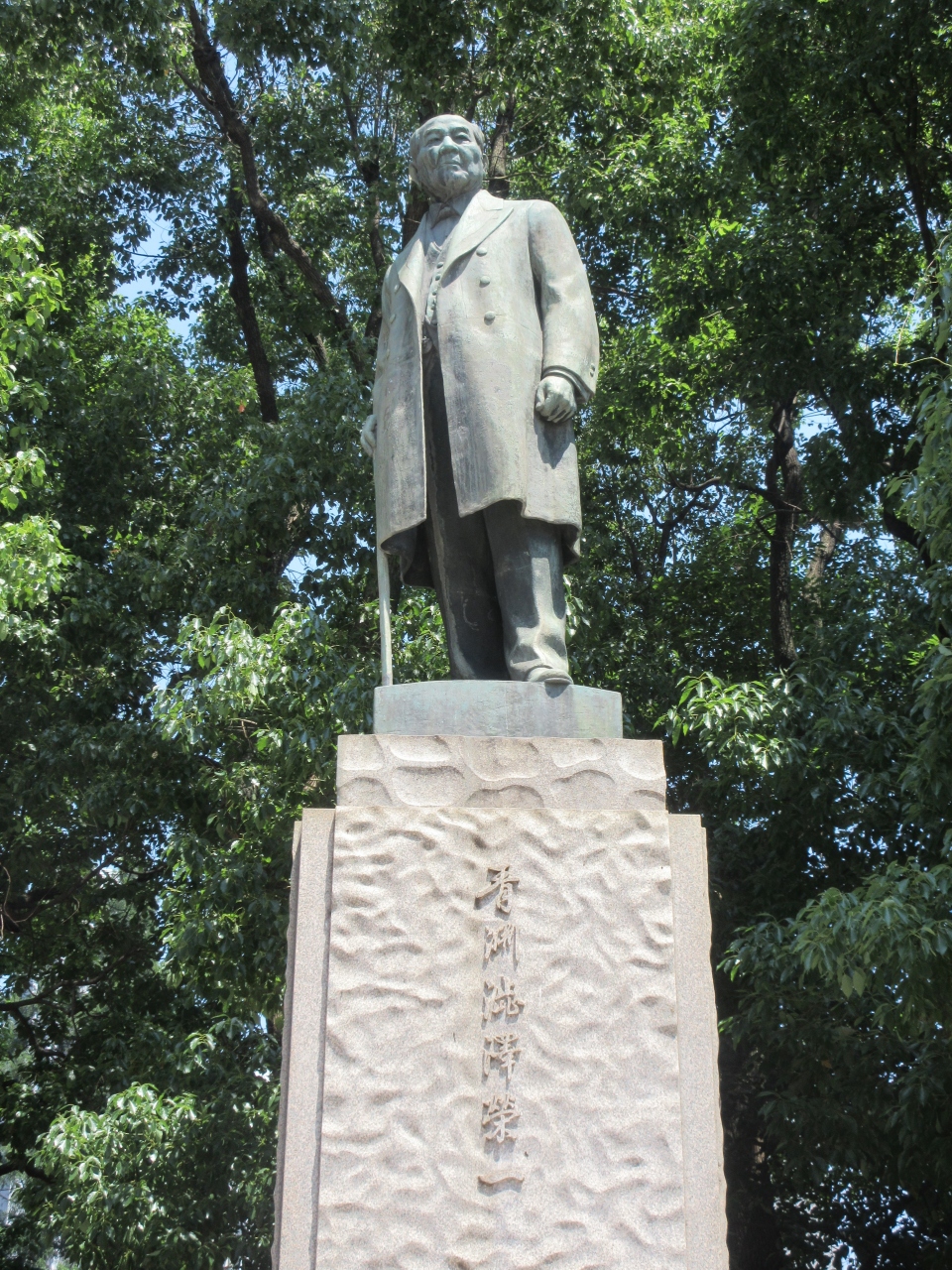 日本銀行向かいに架かる常盤橋のたもとに建つ、5mほどの堂々とした立像です。3年ほど前に訪れた時は、周辺が工事中だったため、落ち着いて眺めることができませんでした。今回、修復工事を終えて新しくなった常盤橋門址に架かる常盤橋を訪れた際に再度立ち寄りました。日本最初に銀行だった第一国立銀行が存在した方向を向いている像は3年前と変わりませんでしたが、大河ドラマの主人公になったり、1万円札の肖像になったりと大活躍の栄一像は、どこか微笑んでいるように感じられました。像周辺には常盤橋や日本銀行の他、貨幣博物館や日本橋など歴史あるスポットも点在しているので、歴史に興味ある方には面白いエリアだと思います。