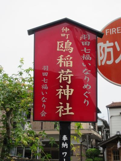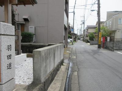 羽田大鳥居から5分ほど、住宅地にひっそりと建つ鴎稲荷神社に羽田道と刻まれた石碑が建っています。碑に書かれた説明によると、江戸時代に、旧東海道・内川橋から大森、糀谷を通り、現在、羽田大鳥居が建つ弁天橋まで通じていたそうで、羽田弁才天への参詣や羽田で取れた魚を運ぶ道だったとのことです。神社前の道は、羽田七曲りの一つで、周辺は漁業専業の町だったそうです。現在その面影は見られませんが、碑に書かれた説明で当時の様子を知ることができました。