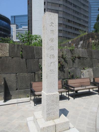 10年前の東日本大震災で大きな被害を受けた常盤橋の修復工事が終了し、5月から橋を渡れるようになったという新聞記事を読み出かけてきました。江戸時代には、江戸城の正門・大手門に向かう外郭正門があったところです。新しくなった橋には、大理石で造られた八角形の親柱と、植物の模様が施された欄干が設置され、まばゆいばかりに輝いていました。江戸時代の橋を復元したためか、橋の両脇には歩行者用のスペースが、橋の中央には馬車や人力車用のスペースが造られています。橋のたもとには常盤橋門址と刻まれた石柱が立ち、石柱の後ろには当時の門跡を連想させる石垣も積まれています。新聞記事を見て立ち寄ったのか、カメラ片手に訪れる人がちらほら見られました。