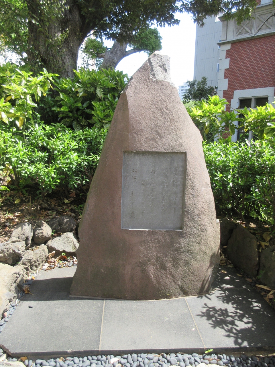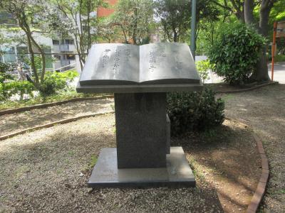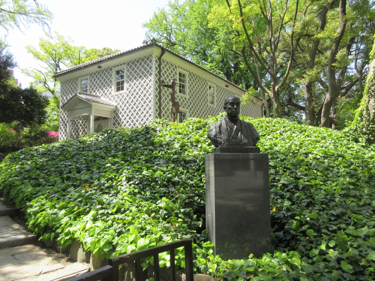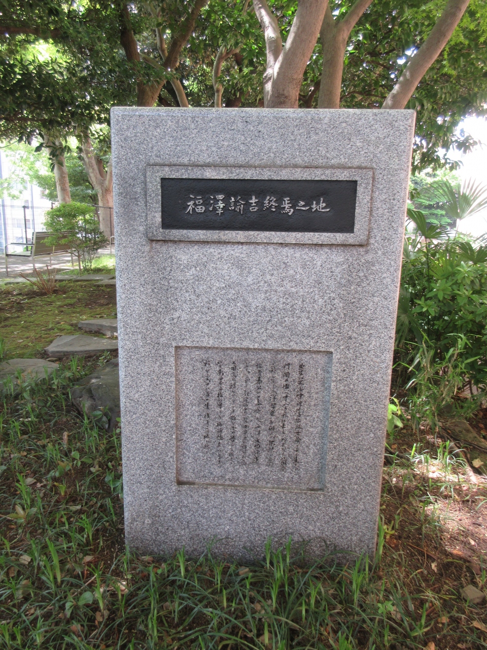 慶應義塾大学三田キャンパス正門から南校舎前の石畳の道を上がっていった先にベンチが設置してある福澤公園があります。福澤公園内の東館寄りに石碑がありました。碑文が彫られていましたが読めませんでした。正門でもらった三田キャンパスガイドによると福澤公園は福澤諭吉の旧宅跡で、亡くなるまでの30年間を過ごしたそうです。キャンパス内に住んでいたことを知りました。演説館前にある福澤諭吉像と共に見ると創始者の実感がわきます。三田キャンパス見学の際に寄ってはいかがでしょうか。
