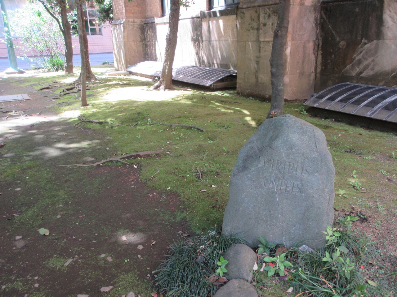 慶應義塾大学三田キャンパス正門から南校舎を通ったところに大イチョウがシンボルの広場があります。広場の右奥に塾監局が建っています。図書館旧館近くの塾監局入口の左にある青石がVIRIBUS UNITISの碑です。刻まれた字が薄くて、ただの石のように見えます。説明がなかったので後で調べると、1909年に普通部の学生が建立したことと、VIRIBUS UNITISはラテン語で力を合わせてという意味であることを知りました。思いもかけないところに石碑があったので驚きました。