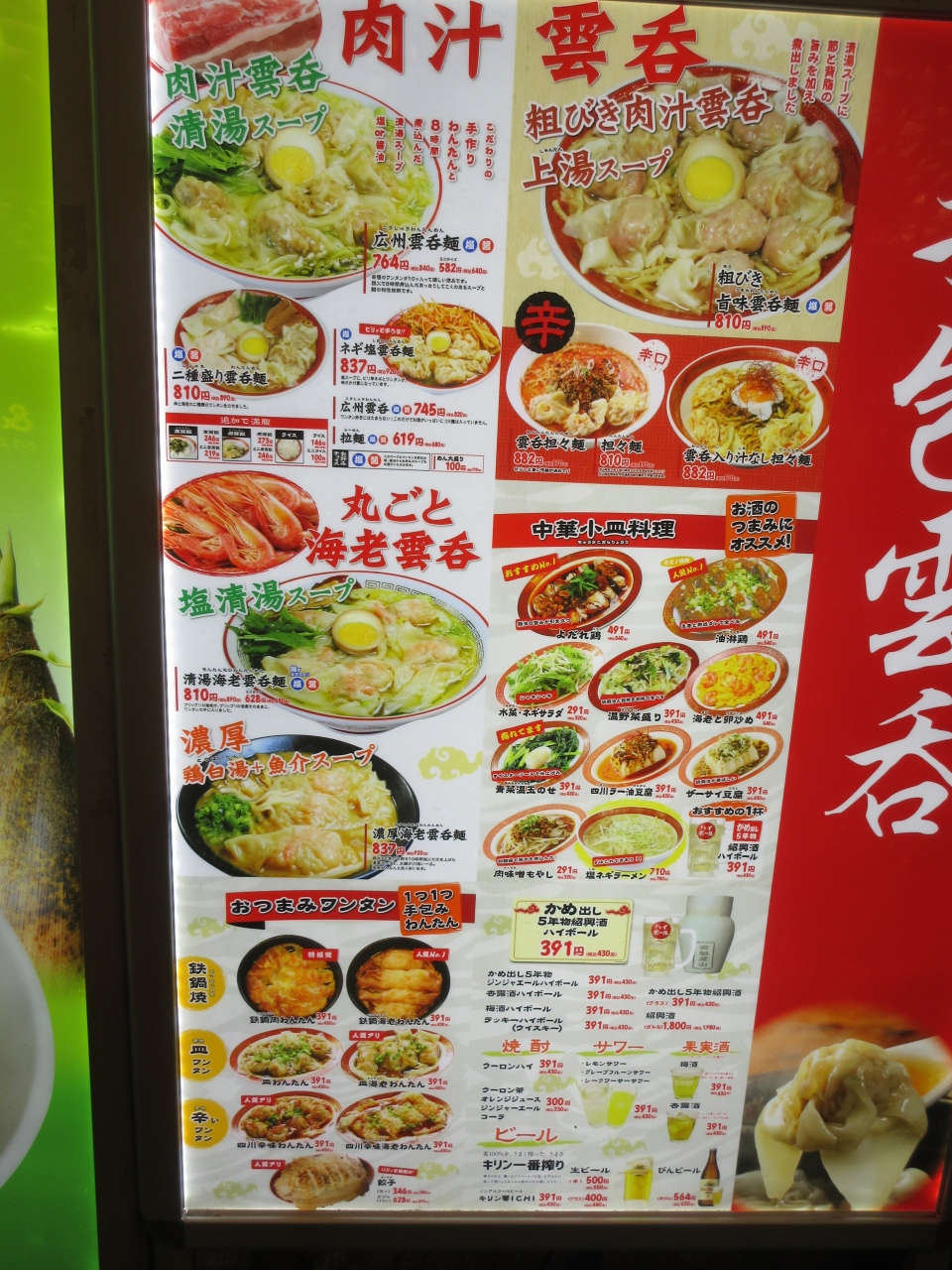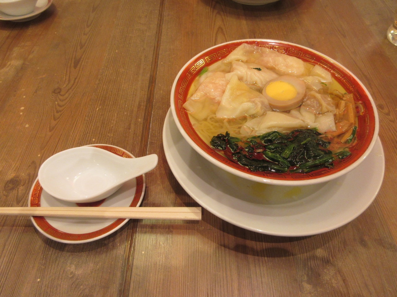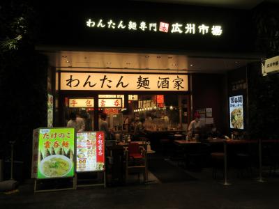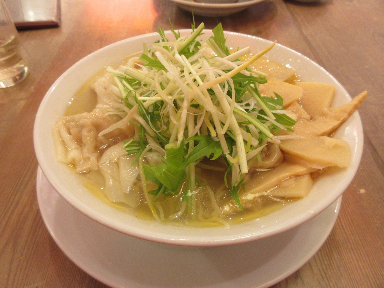 田町駅東口前のムスブ田町S1階にあります。慶應義塾大学三田キャンパスを見学した後、11時過ぎにランチで利用しました。入店した時は客が少なかったですが、食べ終わった11時50分にはサラリーマンでほぼ満席になっていました。たけのこ雲呑麺の麺大盛りと二種盛雲呑麺塩スープを注文しました。細麺はこしがあり、たけのこ雲呑麺は塩スープで豚雲呑が7個のっていました。二種盛雲呑麺は豚雲呑3個と海老雲呑が3個のっていました。卓上に雲吞につける調味料がありお好みで食べます。ラー油、甘酢漬け玉ねぎ、生姜酢、中国醤油があります。海老雲吞には甘酢漬け玉ねぎが一番合いました。豚雲吞に他の調味料をつけて楽しみましたが、甘酢漬け玉ねぎが自分好みでした。つまみが色々あり、仕事帰りに寄りたい店です。