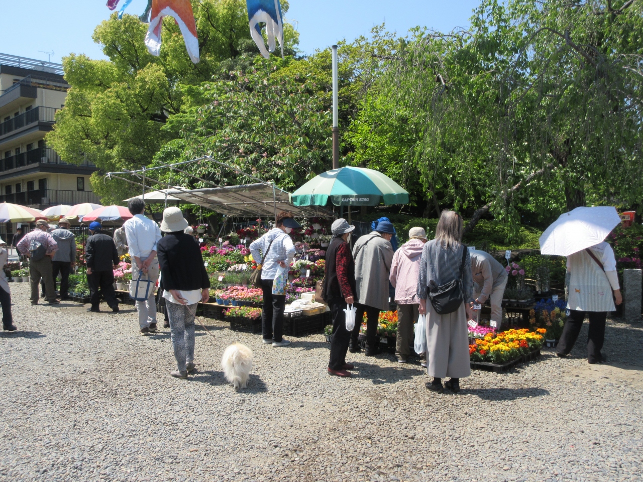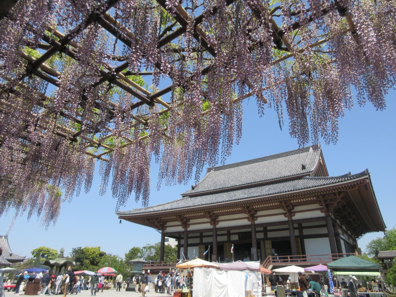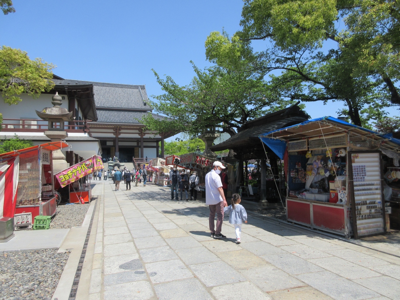 弘法大師の縁日があると知り、都バスに乗り西新井大師バス停で降りて参道を歩きました。バス停から3分ほどで山門に着きました。お参りに来る人が多く、境内に屋台がたくさん出ていました。本堂の賽銭箱の横にきれいに咲いた牡丹の鉢植えが並べてありました。第一牡丹園の花はほとんどが終わっていて、咲いている花はわずかでした。つぼみがついている株もありました。山門近くの藤棚は花がきれいに咲いて、藤棚を囲む柵にベンチ代わりに座って休んでいる人がいました。屋台は太子前駅から出ていて、本堂の裏にもありました。わかめ、豆、七味唐辛子、佃煮、装飾品、服、マスクなどの小物などを売っていました。中にはレコードやバッグなどを売っている屋台もありました。孫娘にかわいい手作りマスクを買いました。西新井大師には時々行きますが、いつもは閑散としているので弘法大師縁日のにぎわいに驚きました。境内の外にちんどん屋さんが浴場の宣伝に来ていました。久しぶりにわくわくしたひと時でした。