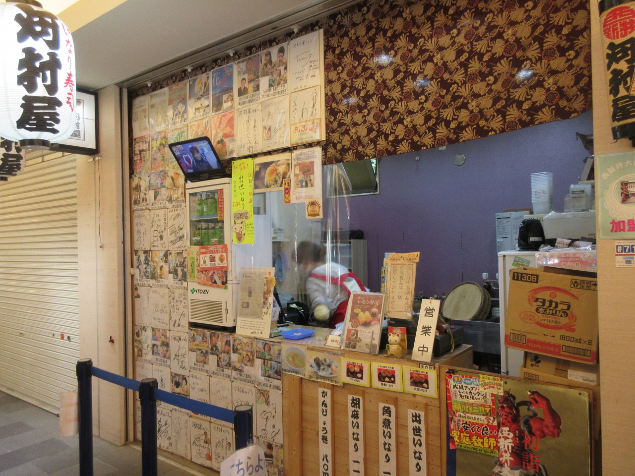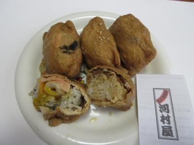 西新井大師参道にある狭い横丁です。ソフトクリームの美味しそうなカフェ、仏具店、厄除け開運のだるまを売っている店、定食屋、居酒屋などが並んでいます。西新井大師の縁日に行った帰りに、門前華永路にあるいなり寿司河村屋で買って自宅で昼食に食べました。タレントやアナウンサーの色紙が店頭に貼ってあったので、買うことにしました。煎りゴマがたっぷり入った胡麻いなり、細かい豚の角煮が入っている角煮いなり、味付けうずら半熟卵が入った出世いなりを購入しました。甘くジューシーないなり揚げが美味しく、おかずを一緒に食べているようないなり寿司でした。角煮にマヨネーズを少しつけると味が変わりました。いなり寿司が好きな方に食べていただきたい変わり種のいなり寿司でした。