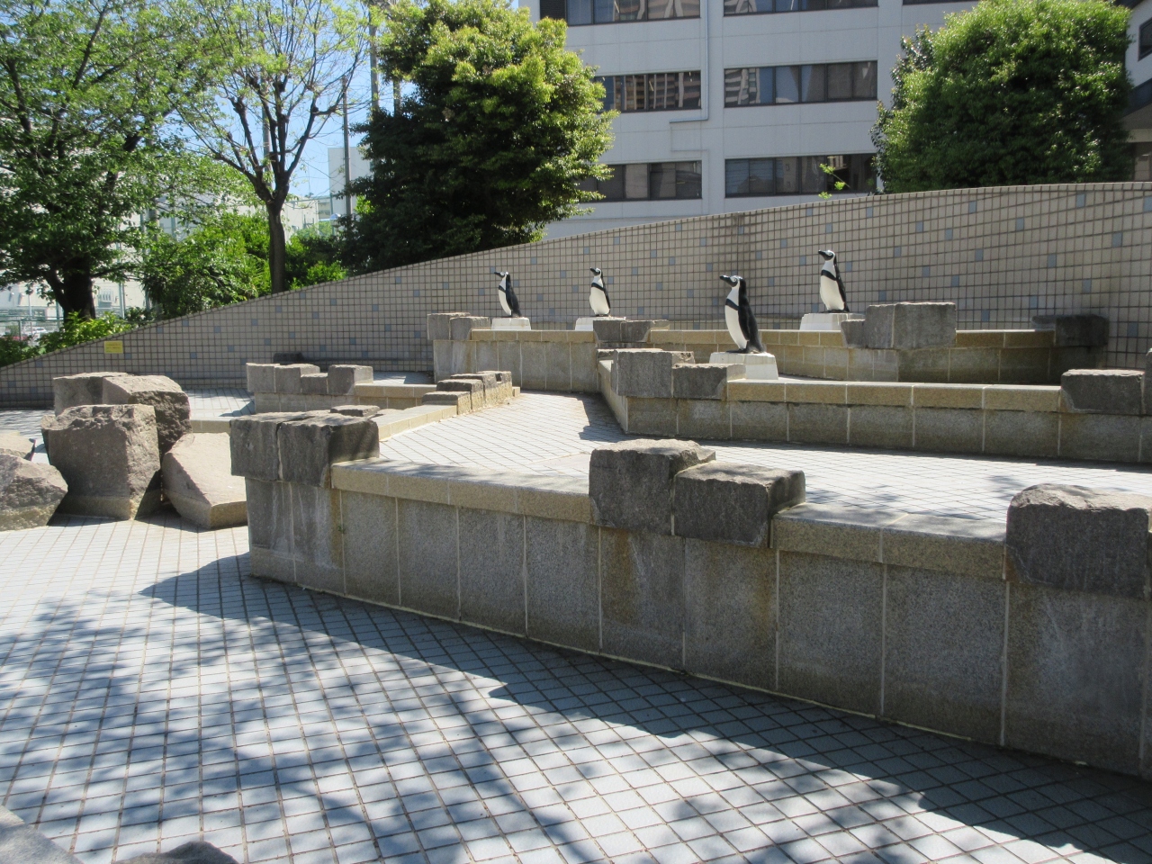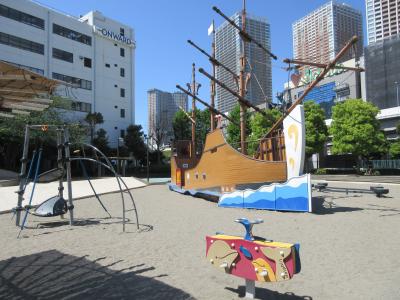 JR田町駅東口から1㎞程、海岸通り沿いに造られた児童公園です。園内には日本で初めて南極探検に向かった開南丸が、芝浦から出発し芝浦に帰港したことを記念して、南極探検記念碑が造られています。碑の横には砕氷艦・初代しらせのスクリュープロペラも保存されています。南極大陸をイメージしたペンギンが飾られたじゃぶじゃぶ池や、開南丸をイメージした遊具も造られています。公園の隣には、放送施設やナイター施設が完備された人工芝の少年野球場もあります。公園周辺は、日本最初の職業野球チームの本拠地だった芝浦球場があったところでもあると説明されていました。いろいろな歴史を秘めた公園です。