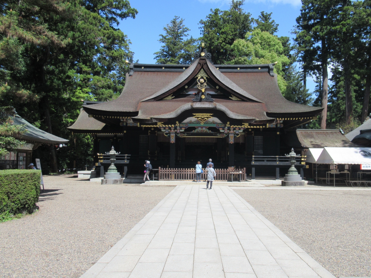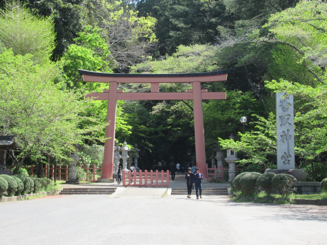 国家鎮護の神を祀り神宮として、神武天皇の頃に創建されたと伝わる、伊勢神宮や鹿島神宮と共に江戸時代まで神宮の名の使用が許されていた歴史ある神社です。駐車場の先に造られた参道商店街を抜けた先には大きな鳥居が建ち、その先の参道にはたくさんの奉納された灯籠が建ち並んでいます。江戸時代に造営された楼門と、檜皮葺で黒漆の本殿は堂々としていて威厳が感じられました。本殿の裏手の本殿側から参拝できる造りは珍しく感じました。楼門から100mほどのところには、伊勢神宮遷宮の際の古材を使用した奥宮も鎮座しています。楼門と奥宮の間には、地震を起こす大鯰を抑えるために地中深くまで差し込んでいるとされる要石も置かれています。緑豊かな森の中に鎮座する厳かな神宮です。