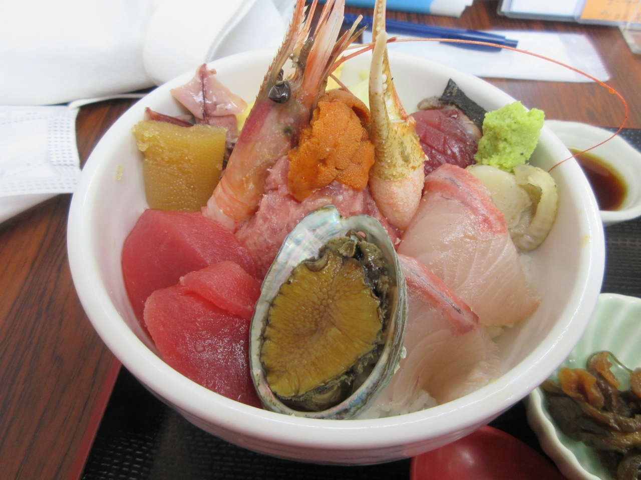 京成本線・千住大橋駅から2分ほどのところに建つ、水産物専門の足立市場内にある食事処です。13席ほどのこじんまりした店ですが、海鮮丼や魚を使った定食をいただくことができます。ウニやカニ、ホタルイカ、ホタテ、数の子など13種類の旬のネタがのった特盛ごうか海鮮丼をオーダーしましたが、ネタは新鮮で厚みがあり大きく、食べた後の満足感がありました。ウニは甘く、マグロなどの刺身は脂がのっていました。魚で取った出汁が効いたみそ汁も絶品でした。ご飯は無料で大盛にすることもできました。朝8時から午後3時まで営業しています。平日の11時過ぎに訪れたところ、お客さんは数人で、ゆっくり味わって食事をすることができました。