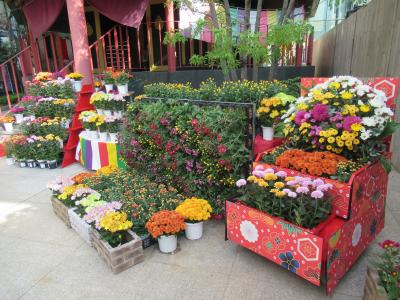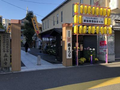 11月初旬、巣鴨地蔵通り商店街の入口に建つ江戸六地蔵尊の一つとして真性寺と、とげぬき地蔵で知られる高岩寺、大正大学がコラボして、三カ所に分かれて菊まつりが開かれます。3カ所の会場のうち、千輪作りや盆養、懸崖作りの菊など最も多くの菊が並ぶ真性寺は、商店街の入口に建っていることもあり多くの人が菊の観賞に訪れます。多くの露店が並ぶ4の日(縁日)に合わせ訪れると、菊まつりで賑わう真性寺と活気ある商店街を楽しむことができます。