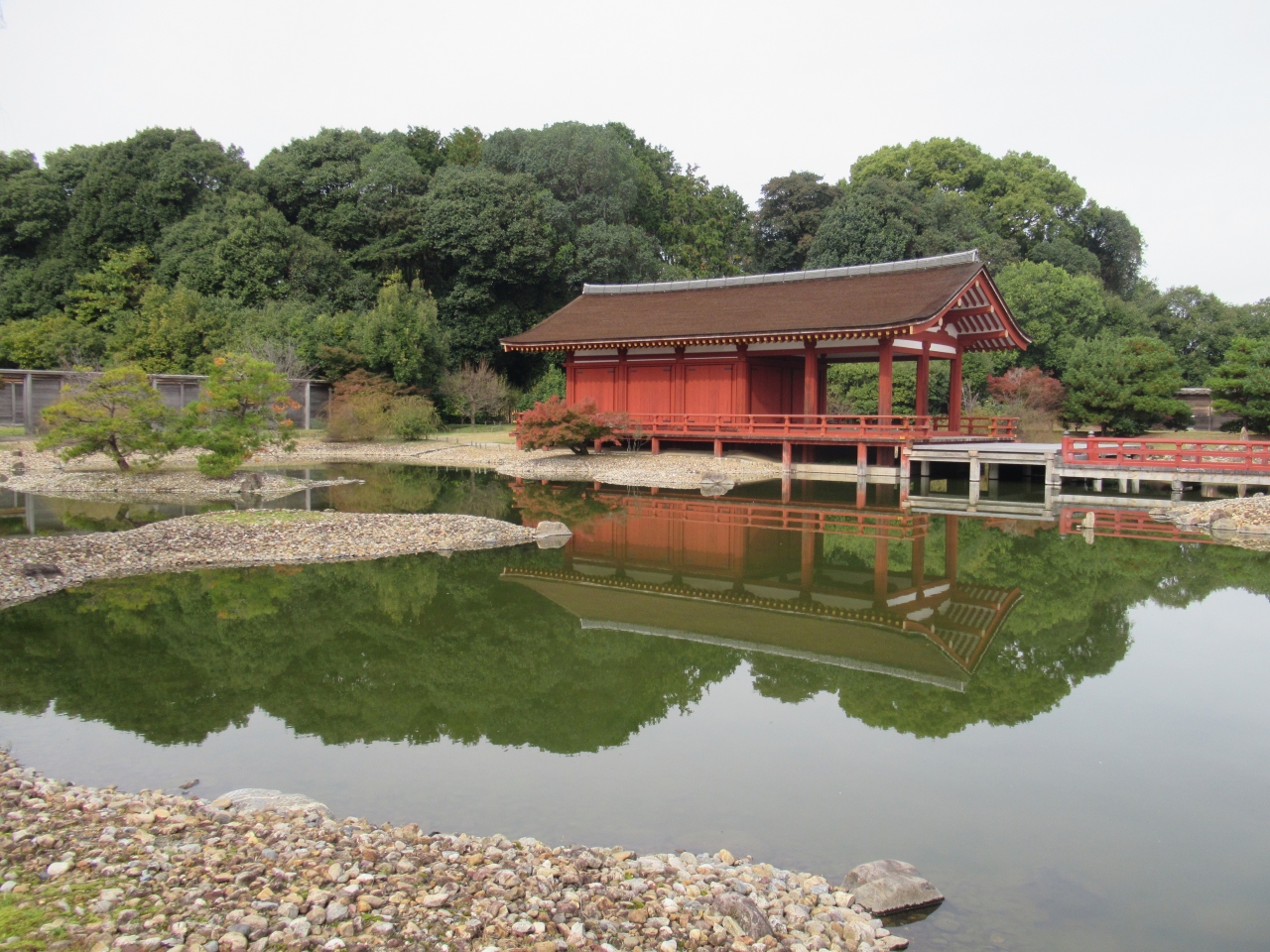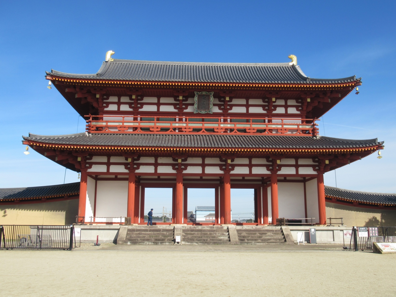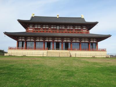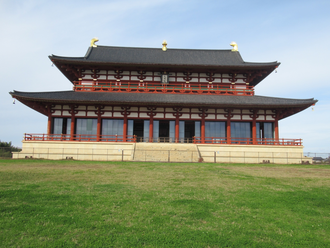 平城宮最大の宮殿として建っていた大極殿が復原されています。当時、天皇の即位や海外からの使節との謁見などに使用された、平城宮の中核をなしていた建物です。幅44m、高さ27mの堂々とした圧倒される建物です。中には天皇が座った玉座や、瓦葺屋根の両側に取り付けられた鴟尾の模型などが展示されていて、ボランティアの方から説明を聞くこともできます。大極殿から大極門の間の広場は、高貴な人物しか入ることができなかったという話が印象的でした。確かに少し高くなった大極殿から広場を見下ろすように造られていて、威厳ある建物という雰囲気が感じられました。
