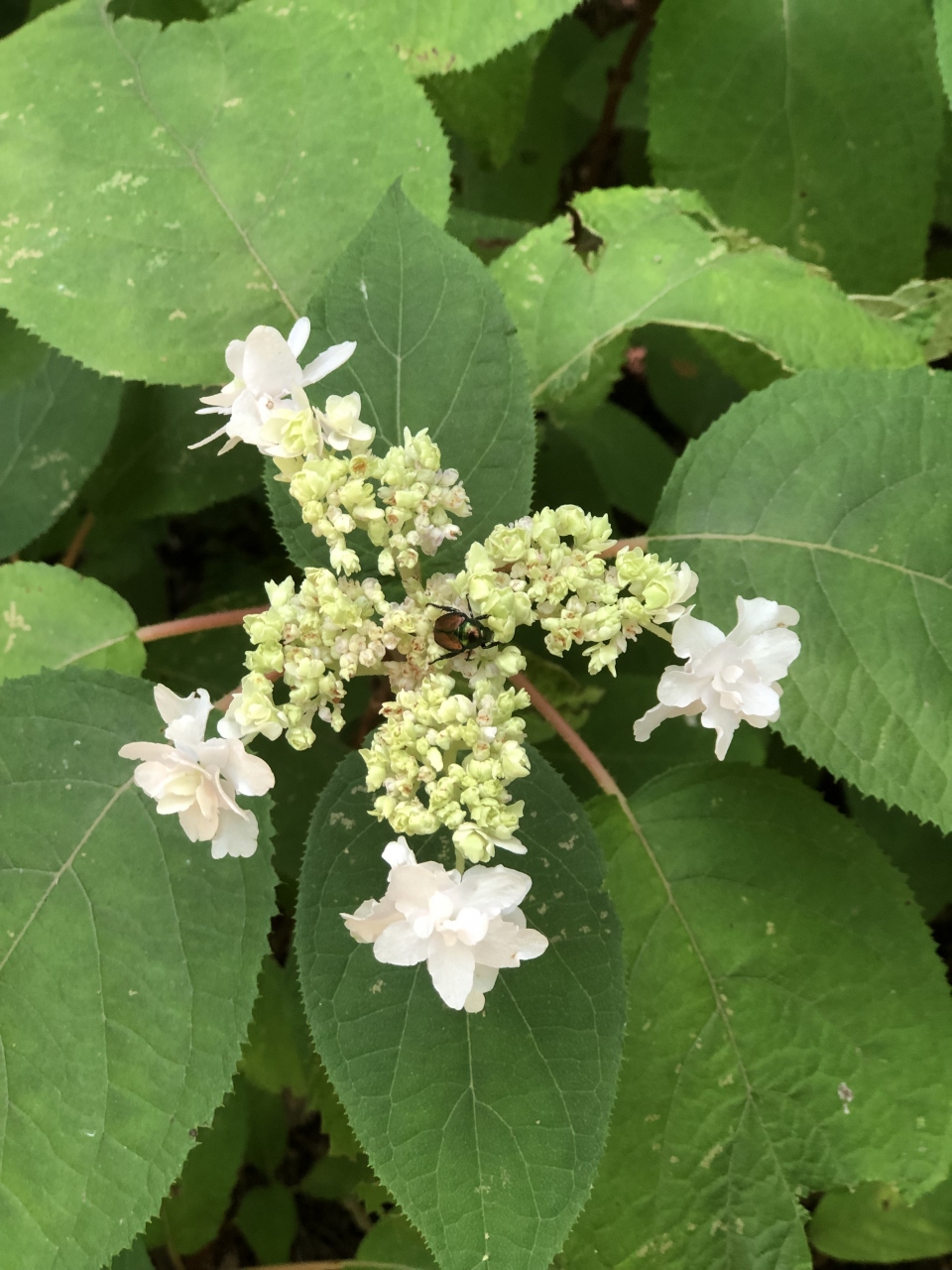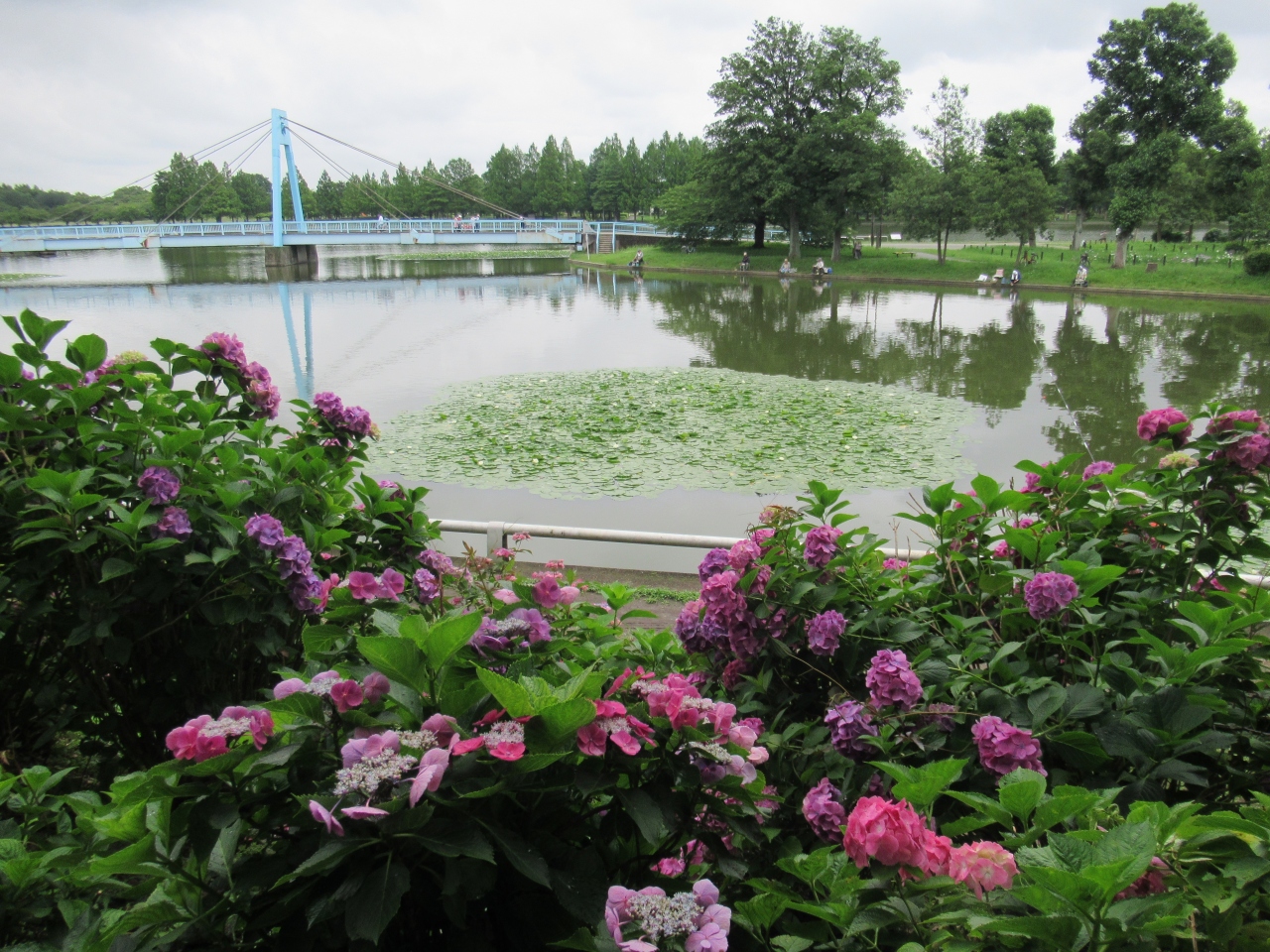 車で都立水元公園へ平日午前に行きました。9時過ぎに着いたので駐車場は空いていました。外溜に面してベンチが並び、アジサイが咲いていました。公園内の樹木に説明板があり、木々の名前を確認しながら散策しました。メタセコイアの森やイチョウ並木など広々とした公園ならではの清々しさを感じました。内溜で釣りをしている人たちがいました。白い睡蓮が咲いていてきれいでした。内溜脇の遊歩道は桜並木になっていて、桜の木の下にピンクや赤紫や水色や青色のアジサイが咲いて、改めて樹木と花の公園の素晴らしさを満喫しました。花菖蒲も美しかったです。