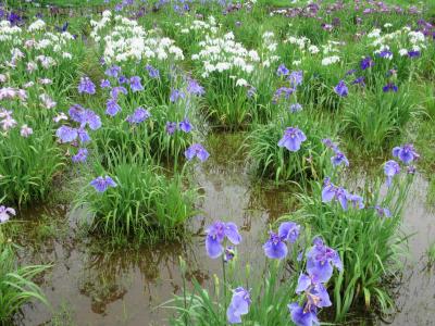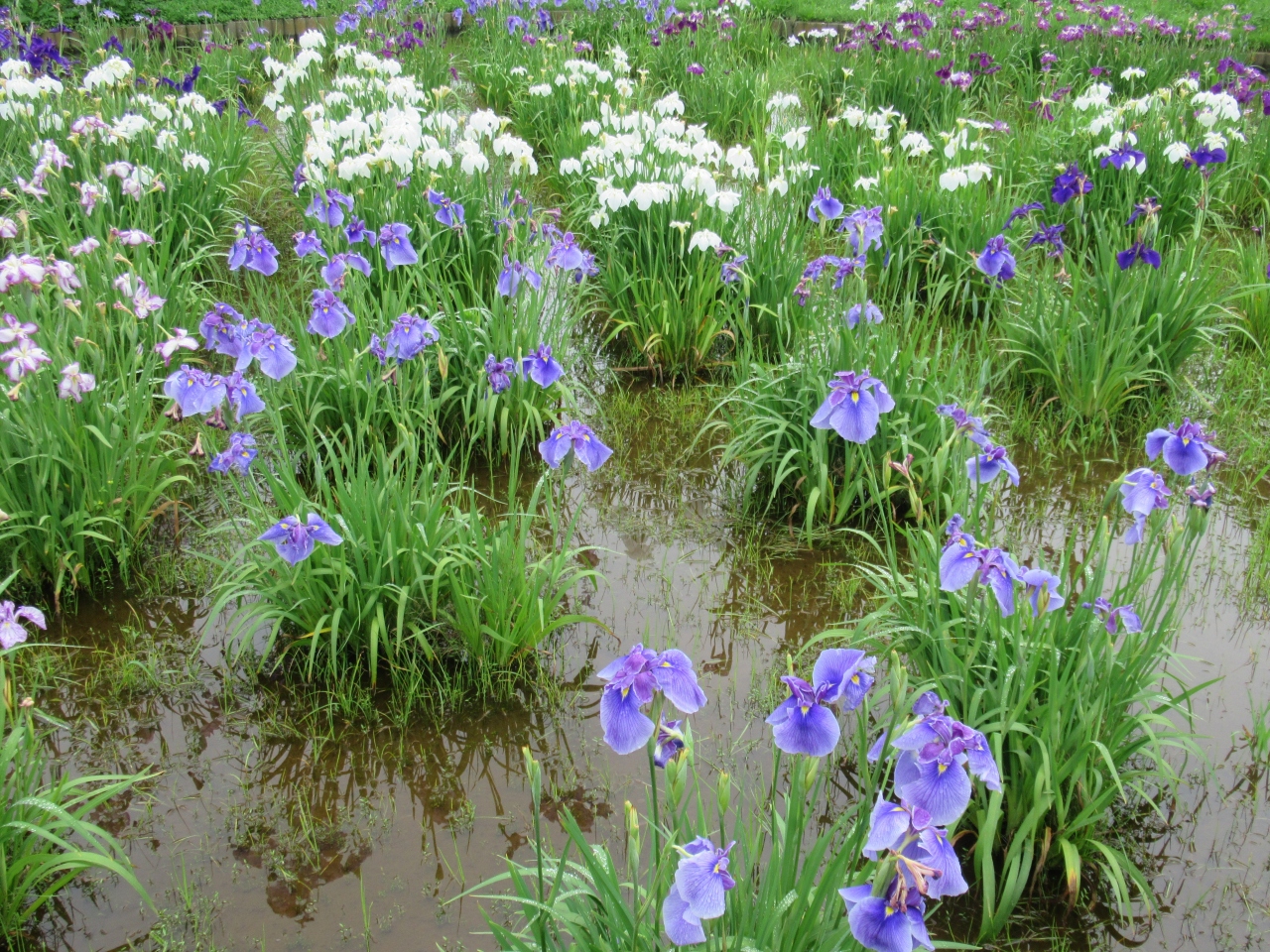 2023年は5月29日~6月18日に葛飾菖蒲まつりが行われました。広い都立水元公園の花菖蒲園に行きました。住宅地と都立水元公園の間の道路にピンクの提灯が飾られていて、花菖蒲園入口に賛同した会社名が書いてある白い提灯が並んでいました。演歌歌手のポスターも貼ってありました。ステージやパイプ椅子の準備がされていました。訪れた平日9時過ぎは人出が少なく、じっくり花菖蒲を楽しむことができました。花菖蒲の株分けの説明と共に、各田んぼ毎に株分け何年目でその特徴について記した説明板がありました。きれいに咲かせる手入れの過程を知りました。株分け後の年数と花の状態に興味を持ちました。
