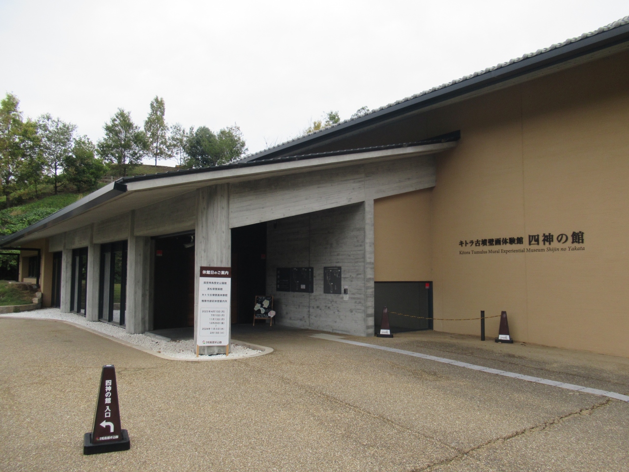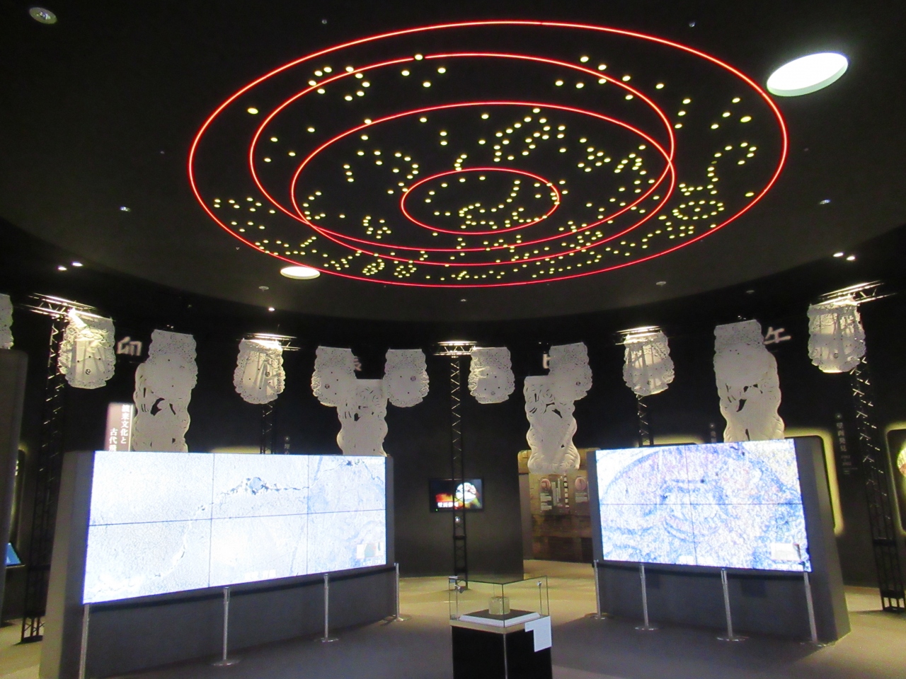 壁画が見つかったキトラ古墳近くに造られている施設です。1年に数日実物を見る機会があるようですが、それ以外の日は古墳からの出土品と共に、映像による壁画を見ることができます。龍や虎、朱雀、十二支、星などが確認されているとのことですが、高松塚古墳ほどはっきり認識はできないそうです。実際、映像による壁画を見てもはっきりわかりませんでした。1300年以上前に築かれた古墳に壁画が残っていたことと共に、それを発見したことにもびっくりです。