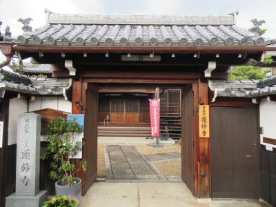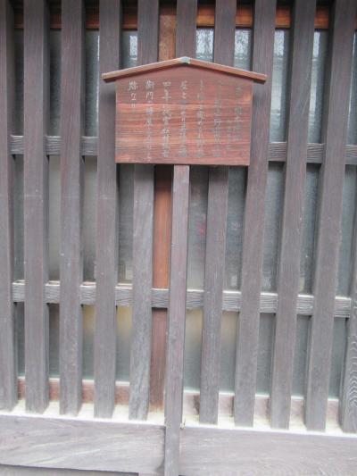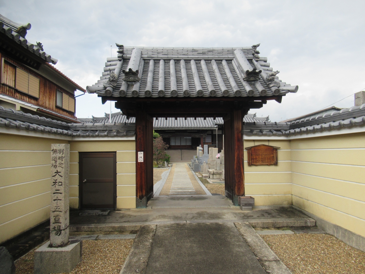 称念寺は今井町の御堂筋に建っています。今井町は元は称念寺の寺内町でした。室町末期に本願寺の一家衆今井氏が道場として造ったのが始まりで、江戸初期に浄土真宗寺院となりました。山門は廃仏毀釈の折、現在の談山神社にあった門を移築したもので、ケヤキ一枚板の扉はみごとです。山門の左に太鼓楼が、右に鐘楼が建っています。本堂は国の重要文化財で、天皇家とのつながりから瓦に菊の紋があります。1877年に明治天皇が客殿に2泊しました。称念寺の向かいにある夢ら咲長屋にいたボランティアガイドさんが、称念寺と今井町の関係や、境内の建物について詳しく説明してくれました。説明後、より興味深く本堂や太鼓楼や山門を見ることができました。