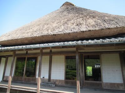 明治以前に建てられた武家住宅で、おとこ玄関とおんな玄関があります。茅葺屋根のおもてとなかえの二つの屋根の間を小棟でつないでいる知覧型二ツ家です。庭のツツジやイヌマキが丸く刈りこまれていて遠くの竹林や木々が借景になっていて奥行きが出ています。住宅を郷土料理店が活用して、庭園に面した座敷に膳が用意されていました。