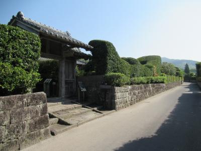 知覧武家屋敷庭園群を見るために、検察庁脇の道路を入りました。入って最初の庭園です。知覧武家屋敷庭園の開園直後に訪れたため、庭園を掃除していた方がいました。挨拶をして入りました。文化文政年間(1804~1829)の作庭です。門を入ると目隠しの石組の壁があります。説明板にこのような折れ曲がった入口は城郭の枡形虎口に由来すると記されていました。他の知覧武家屋敷庭園にもありました。立てた石組と石の塔の後ろに山のように刈り込んだイヌマキの生垣があります。枯滝から石を伝って水が海に流れる様子を見ました。庭に面した座敷に布が拡げてあるのがガラス越しに見えて、風情がありました。苔むした灯籠も魅力です。