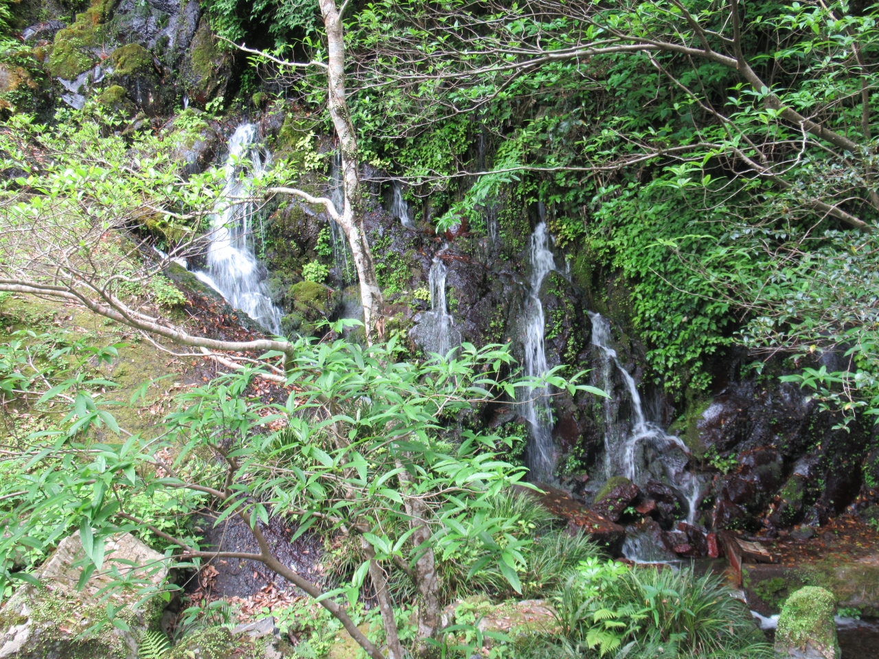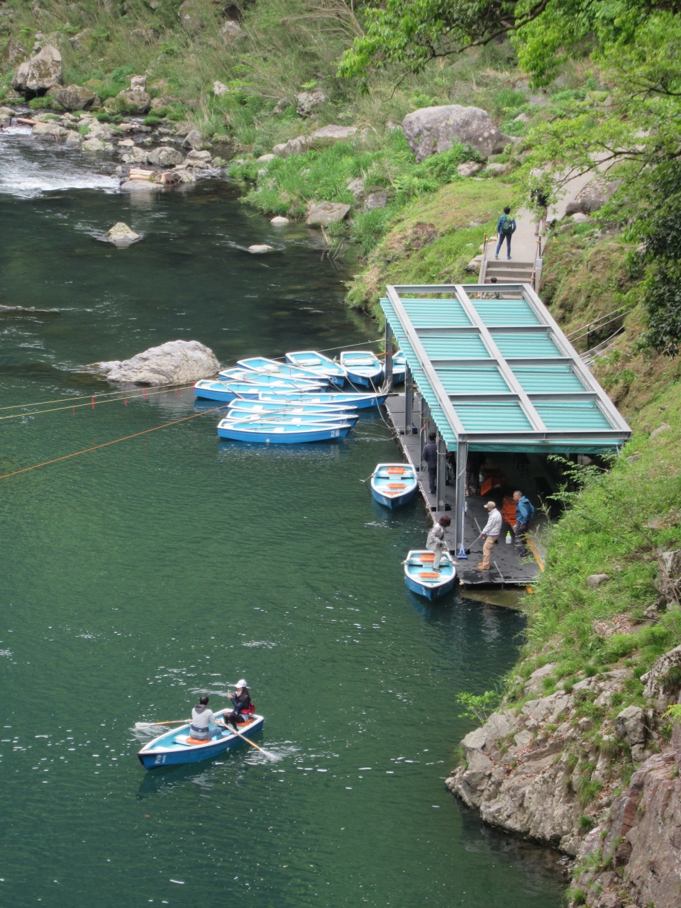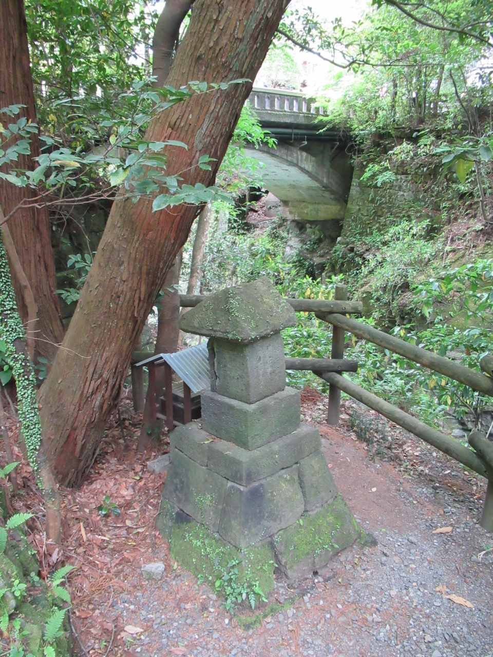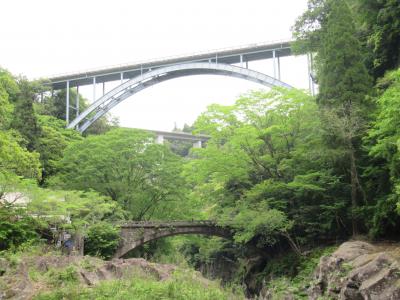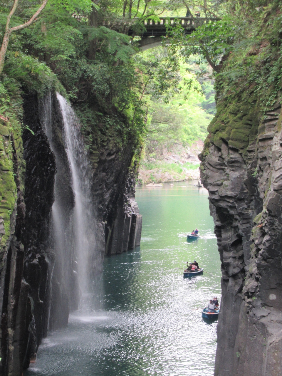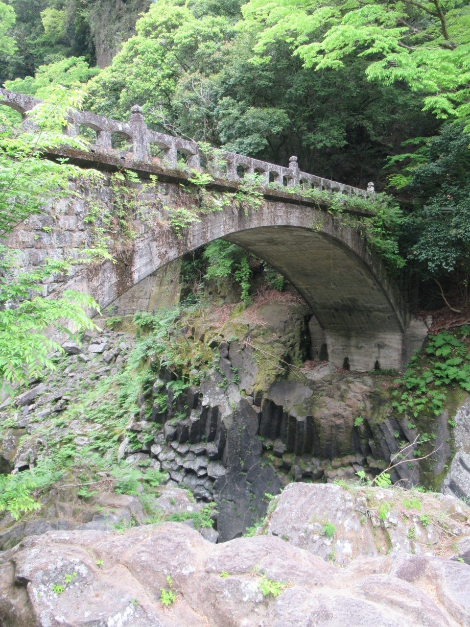 第2あららぎ駐車場から1分ほど、五ヶ瀬川に架かる30mほどの石橋です。大正時代に架けられた時は木橋だったようですが、昭和になって石橋に架け替えられました。高千穂三橋の一つで、神橋の上には高千穂大橋が、さらに上には神都高千穂大橋が架かっています。神橋が架かるさらに下流には槍飛橋が架かっていて、槍飛橋からは高千穂三橋が同時に見えるため、高千穂の観光スポットになっています。