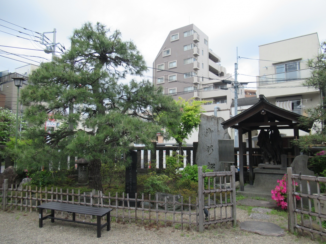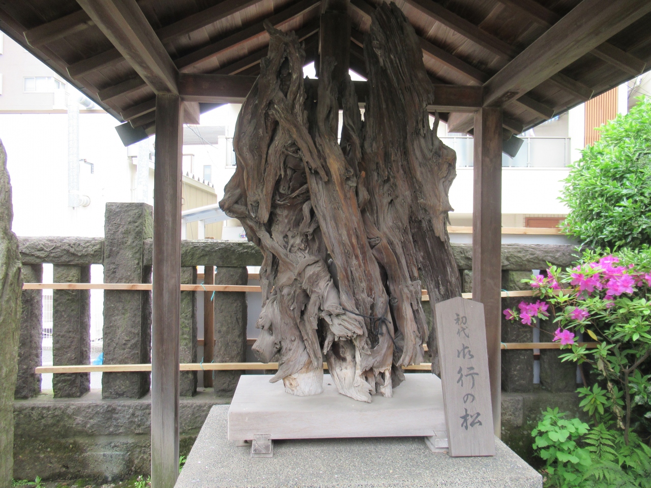 鶯谷駅北口から7分ほどの御行の松通りに建つ西蔵院から、さらに通りを100mほど行ったところに不動尊が祀られています。その一角に江戸時代から根岸の松として親しまれ、歌川広重の錦絵にも描かれた松が植えられています。初代の松は天然記念物にも指定された大きな松だったようですが、現在の松は4代目で初代ほど大きくがありません。松の横には初代の松の根が大切に保存されています。今後の生育が楽しみな4代目、御行の松です。
