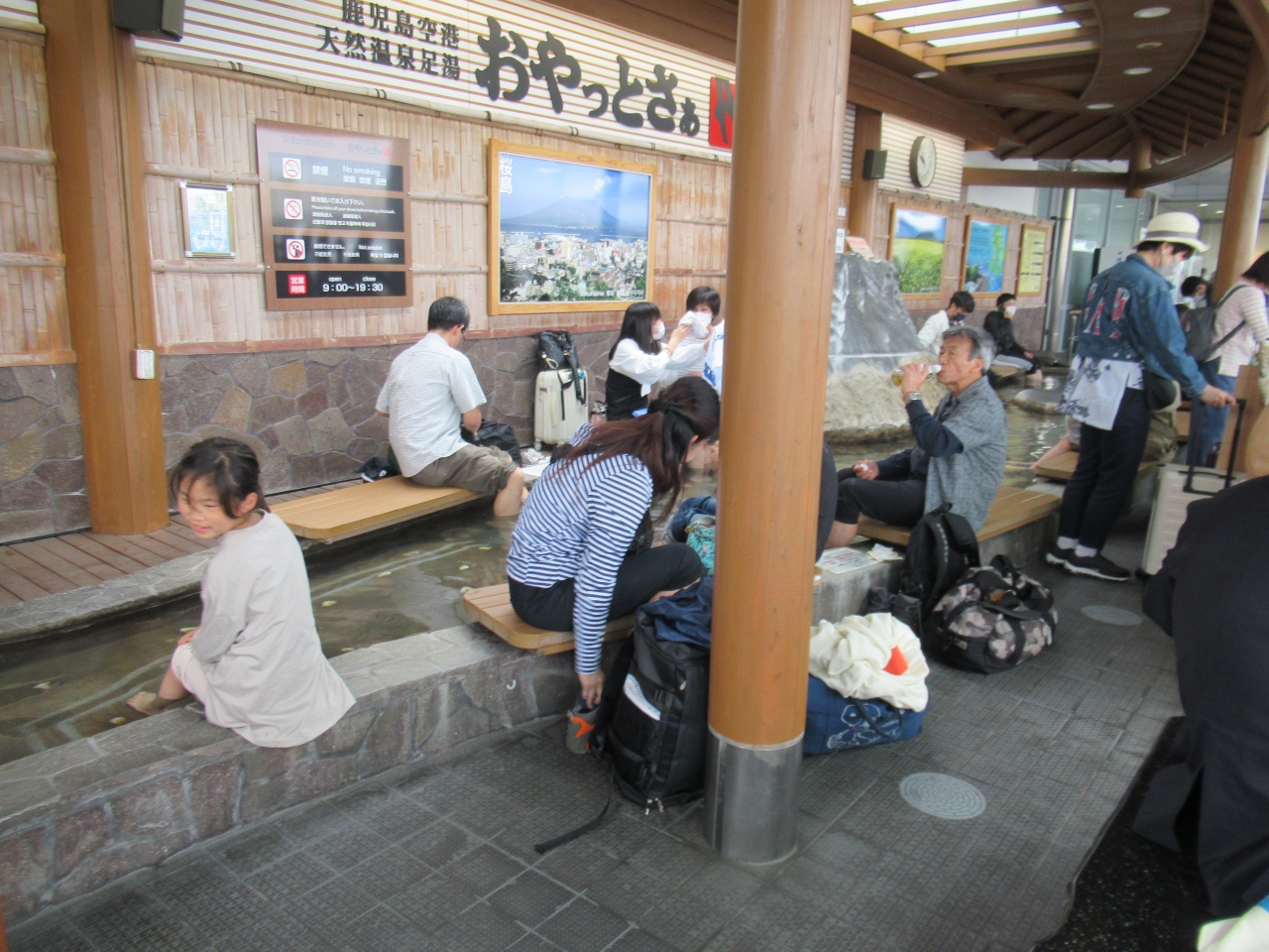 鹿児島空港の出入口の外に造られている無料の天然温泉足湯です。空港を利用した際に、多くの子供連れの観光客や若者、シニアの方たちが入っていて、車いす利用者も利用できるように工夫されていました。土産にもなる鹿児島らしい絵柄のタオルも販売されていました。鹿児島弁でお疲れさまという意味だそうで、旅に疲れた身体を休めたり、飛行機の待ち時間に利用したりできます。