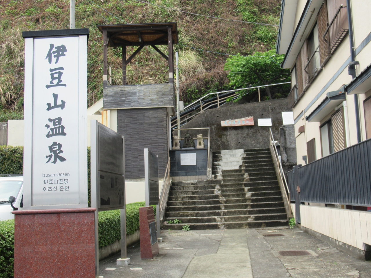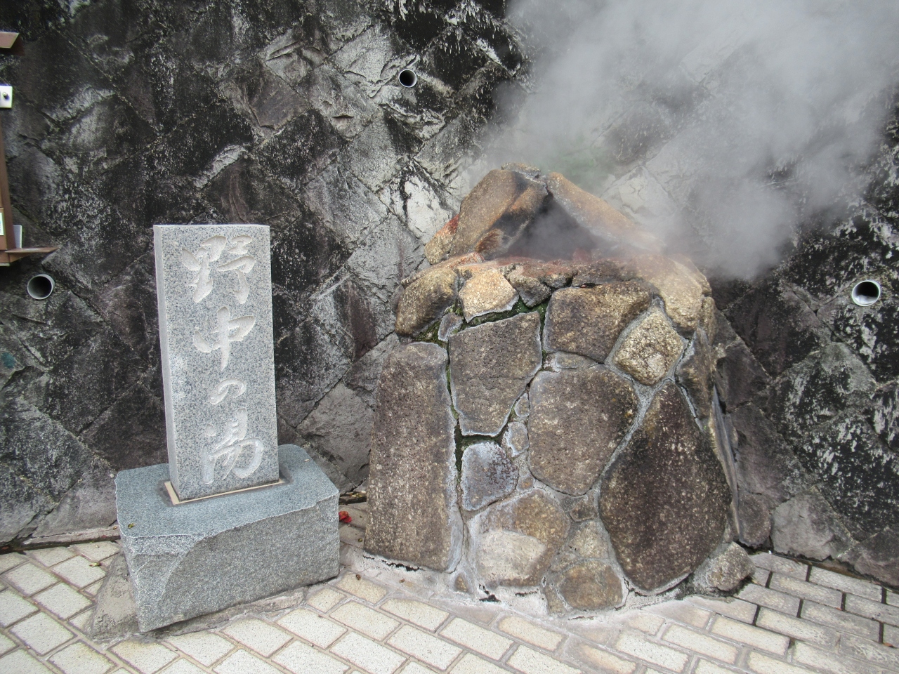 銀座通りの坂を上がっていった先の保育園の向かいにあります。徳川家康が湯治に来たことがあり、以来八代将軍吉宗や十代将軍家治の時代に大湯が度々献上されたそうです。明治に温泉療法が行われました。蒸気が多く噴出した時代もありましたが、休止し現在は人工的に当時の様子を伝えるために湯を噴出していると説明板に記されていました。訪れた時、噴出していなかったので、どこから出るのかわかりませんでしたが、オールコック滞在記念碑や市街電話創始の地碑などを見ていたら、噴出が始まりました。後ろの建物に影響がないように造られた岩石から湯気を出して湯が噴出しました。近くの湯前神社に参拝した後に通るとまだ噴出していました。