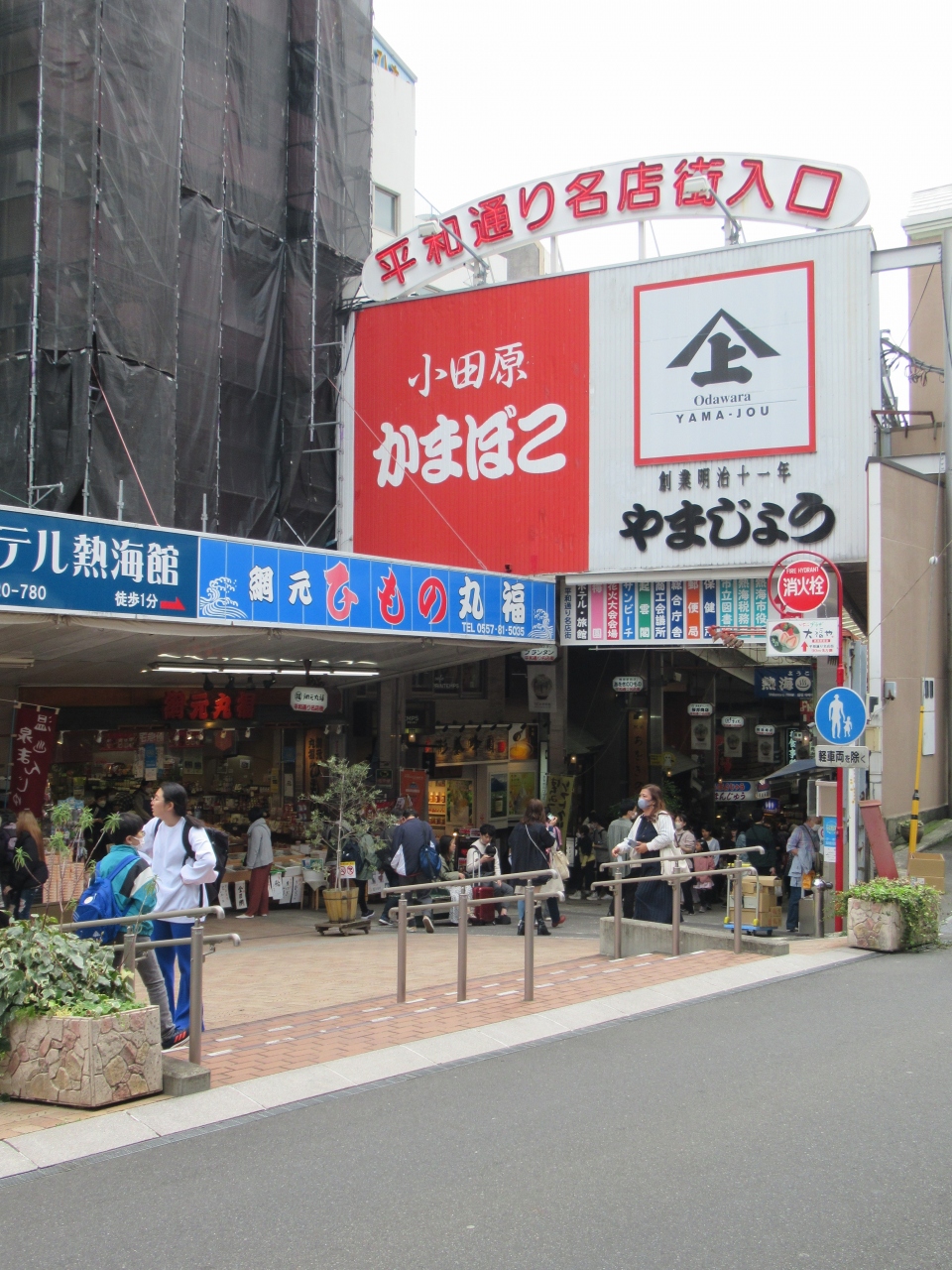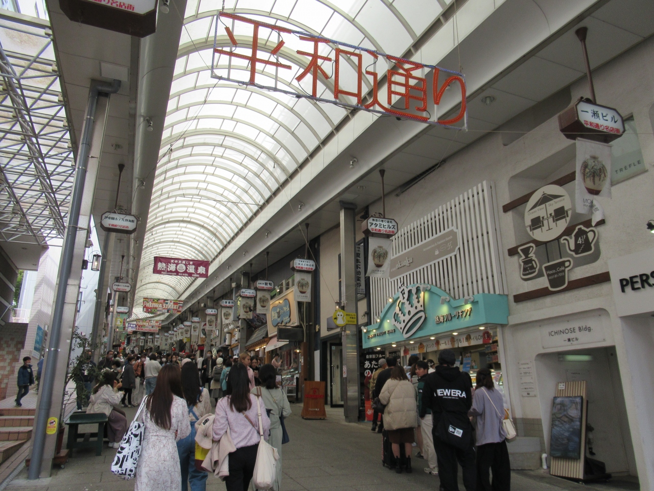 熱海散策をした時に通りました。熱海駅を出ると右前に平和通り商店街のアーケードがあります。駅前にアーケードがある商店街が2つあります。平和通り名店街入口と看板がアーケードにあるので分かりやすいです。飲食店、スイーツ店、土産物屋、干物屋、ホテルなどがあります。通りの中央にベンチがところどころにあり、テイクアウトの食べ物を座って食べている人や休んでいる人がいました。春休みの平日昼は人気の海鮮料理店やテイクアウト店に行列ができていました。若者が多く、広い通りは混んでいました。自分たちは比較的待ちの組が少ないこばやしで海鮮丼と焼き金目鯛の茶漬けとサザエの壺焼きを食べました。どれも美味しかったです。