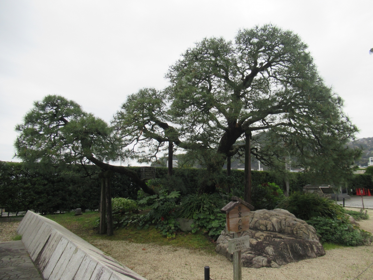 熱海サンビーチ脇の熱海市営東駐車場と国道135号線の間にあります。貫一お宮の像の隣りの緑地帯に金色夜叉の碑と松があります。金色夜叉で有名になった熱海のシンボルです。名場面が迫力ある像になっていました。松は二代目で、初代の松は昭和初期まで羽衣の松と呼ばれていましたが、金色夜叉に因んでお宮の松と呼ばれるようになりました。大事に手入れされているのがわかる松です。隣に初代松の幹が切って保存されています。訪れた春休み平日午後、見に来る人がぽつぽつといました。熱海駅前の商店街の喧騒から離れた静かな場所でした。