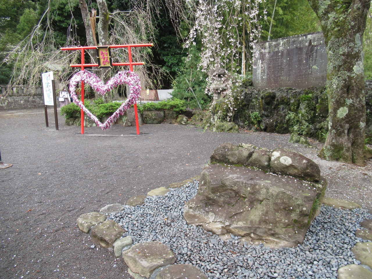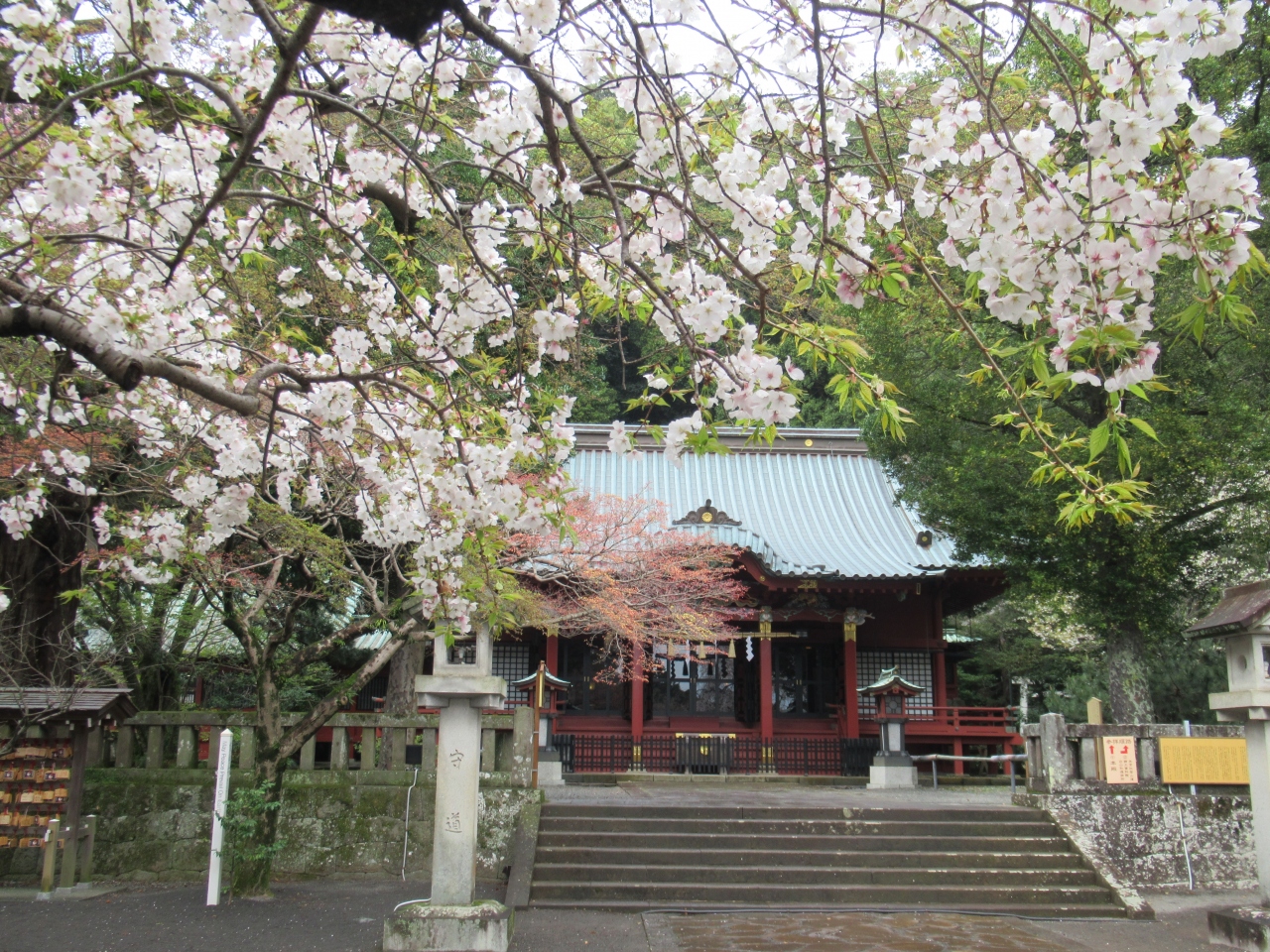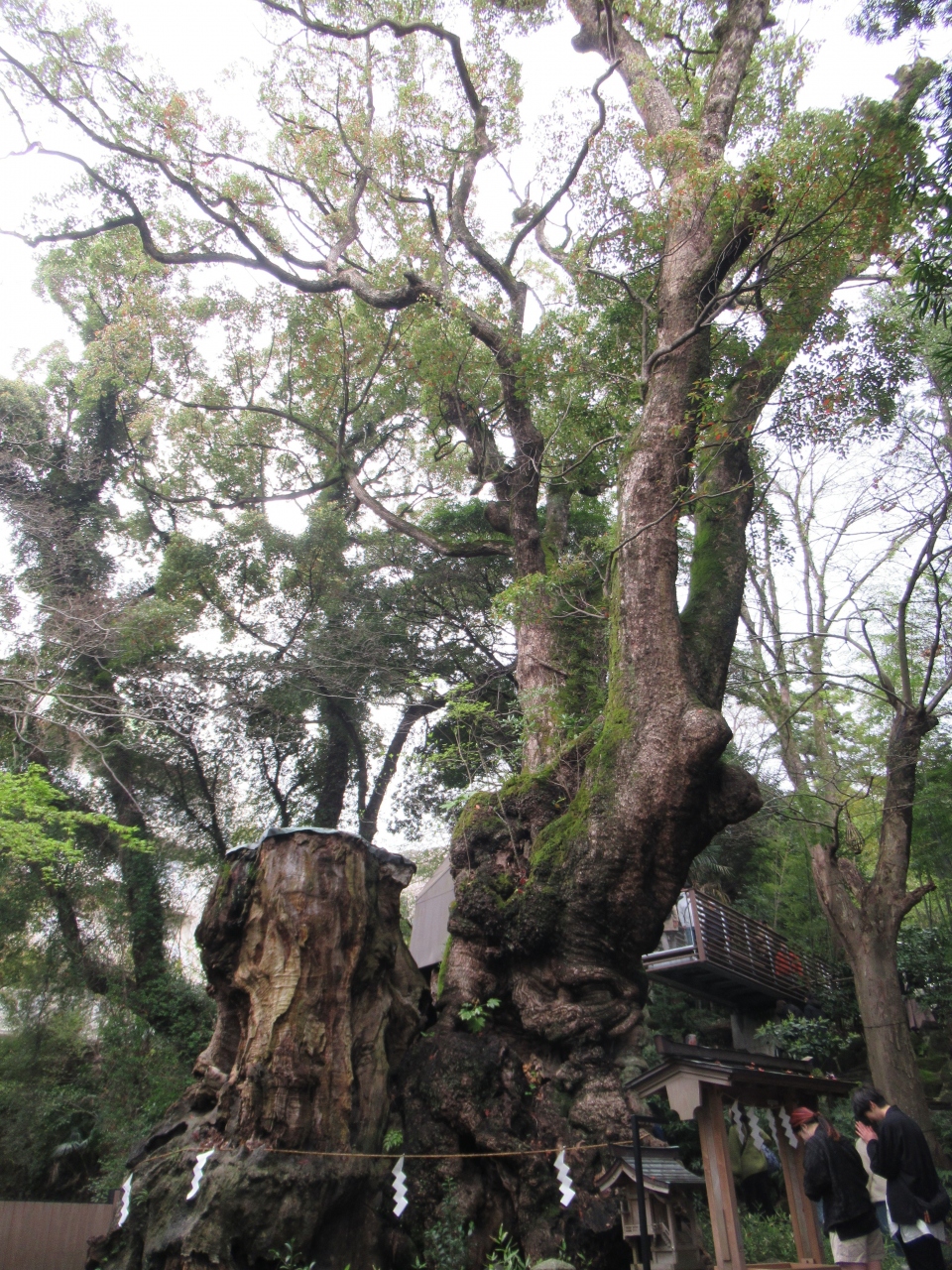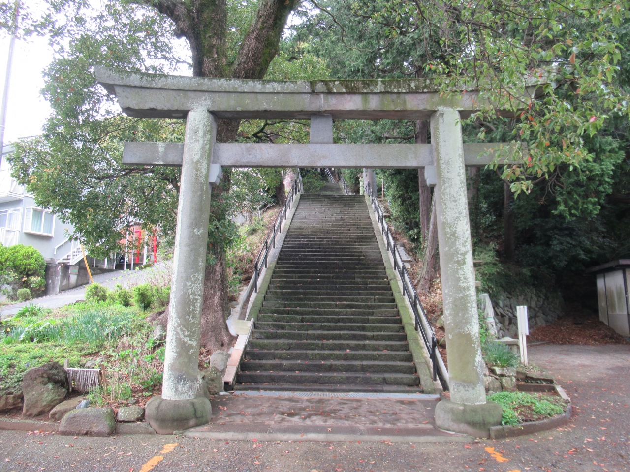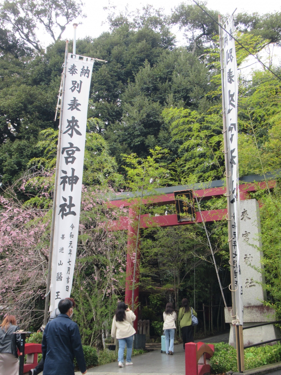 来宮駅から歩いて5分ほどで鳥居に着きます。熱海駅から約20分です。車で訪れ、境内にある駐車場へ行こうとしましたが、満車で来宮駅前の駐車場に停めました。赤い鳥居を見ていたら宮司さんと婚礼の人たちがやってきて、改めて鳥居から本殿へ進んでいきました。熱海郷の地主の神で、来宮大明神と称し、来福や縁起の神として古くから信仰されてきました。祭神は日本武尊、五十猛命、大己貴命です。境内は山の斜面に沿って高くなります。銅板葺き屋根、赤い柱や梁の本殿は石段の先にあります。本殿の左奥に樹齢2100年を超える御神木大楠があり、本殿と同じくらい参拝する人が並んでいました。国指定天然記念物です。鳥居のそばと参集殿の屋上にカフェがあり、若い人たちが利用していました。婚礼の雅楽の音色を聞きながらゆっくり境内を歩きました。本殿前の砂利の上に落ち葉で作ったハートがフォトスポットのようで、カップルが設置された台に携帯を置き写真を撮っていました。若者が多く訪れる神社です。