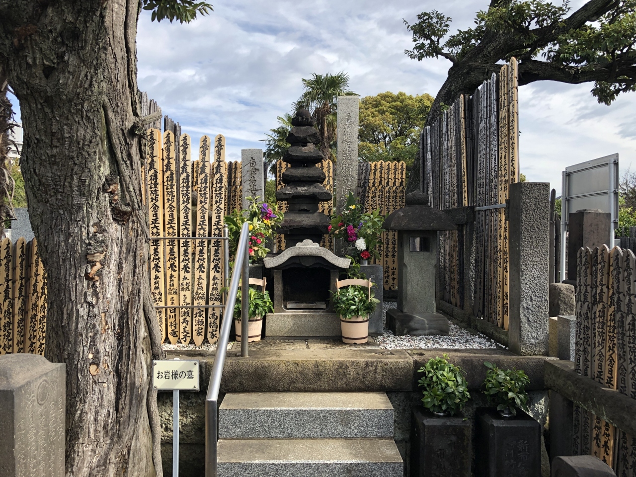 都電荒川線・西ヶ原4丁目停留所から5分ほどのところに建っています。墓地には鶴屋南北の戯曲・東海道四谷怪談のモデルになったお岩さんが眠っています。戯曲に出てくる於岩さんとモデルになったお岩さんは、全く異なった人物で、寺に眠るお岩さんは徳川家の御家人だった田宮又左衛門の娘で、田宮家にあった屋敷社を信仰したことで、貧しかった生計を夫婦で復活させた健気な一生を送った人物だったそうです。善人という設定では戯曲が面白くないということから、東海道四谷怪談というお岩とは全く異なる、於岩という人物設定の脚本になったとのことです。妙行寺の説明板には、お岩さんと御主人の折り合いが悪かったと記されていますが、お岩さんの美徳を祀る四谷の左門町に建つ於岩稲荷田宮神社には、夫婦円満だったと記されています。どちらが真実かは定かではありません。