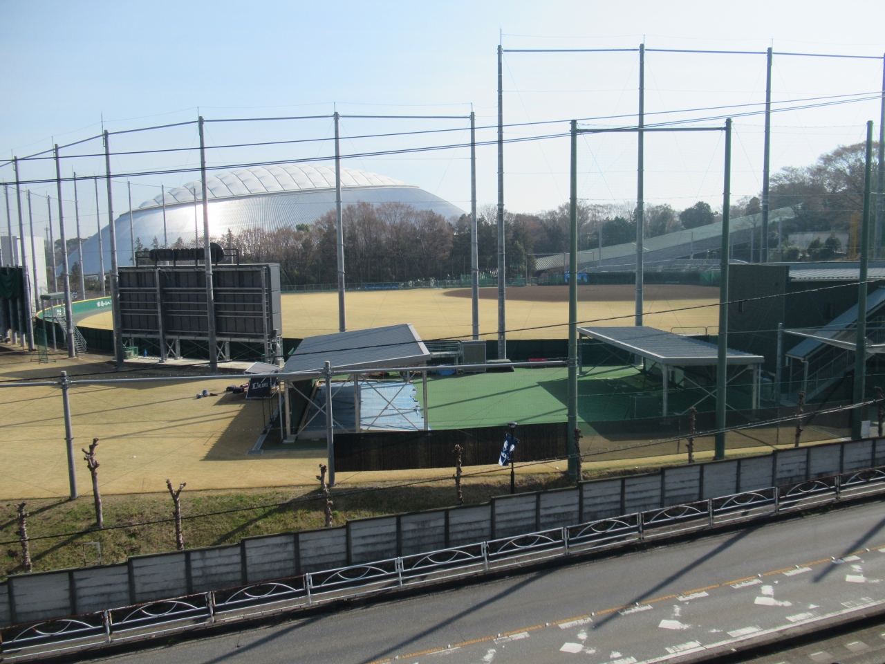西武球場前駅から7分ほどの、1200年程前に開創された山口観音を参拝した際に、寺の墓地からグランドを眺めてきました。プロ野球・西武ライオンズの2軍練習場です。練習は行われていませんでしたが、グランドはきれいに整備され、プロの練習グランドといった様子でした。墓地からはピッチャーの練習ブルペンも眺められました。1軍の公式試合が行われるベルーナドームと隣り合っていて、2軍の選手たちも大いに刺激を受ける造りになっていると感じました。