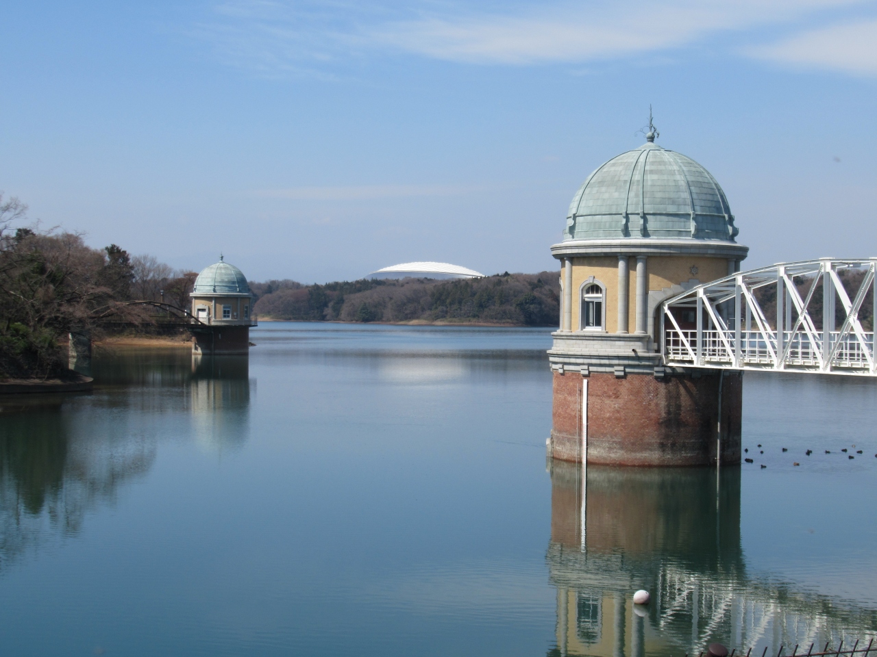 西武球場前駅から7分ほどの、1200年程前に開創された山口観音と重要文化財が数多くある狭山不動尊を参拝した際に足を延ばし、東京の水がめ・村山貯水池がある多摩湖を眺めてきました。穏やかな湖面に浮かぶように建つドーム屋根とアーチ窓の取水塔、遠くには光を浴び白く輝く西武ライオンズ野球場などが見渡せます。晴れた日には富士山も眺められるようです。湖面や堤防沿いには多くの野鳥が羽根を休めていました。長く続く土手の上ではベンチに座り読書する人やサイクリングを楽しむ人、のんびり湖面を眺める人、堤防下の公園を散策する人など思い思いの時間を楽しんでいました。