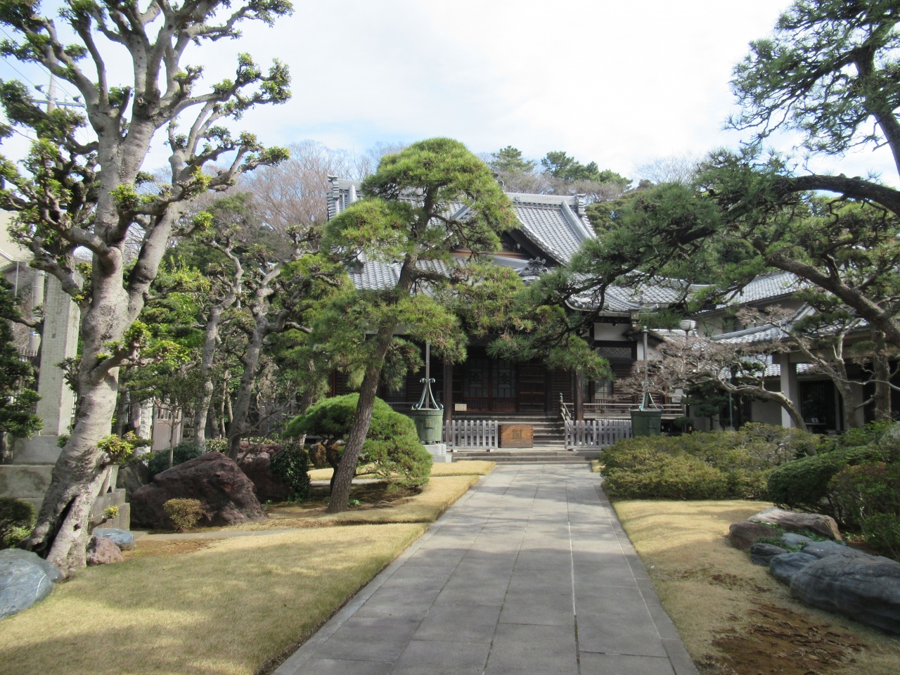 池上駅から本門寺総門方向へ数分歩くと吞川に出ます。吞川を渡り川沿いに右に歩くと照栄院に着きます。1291年に日朗聖人の庵室として開創しました。15世紀中ごろに再興され、1689年に南谷檀林という僧侶教育の学校を開設しました。池上本門寺の三院家の一つです。瓦葺屋根の山門と瓦屋根が大きい本堂が特徴です。境内の奥の階段を上がったところに妙見堂が建っています。本堂前の芝生と大木の庭に青石や赤石などが配置されていてみごとです。山門と庫裡の間の庭は石が敷かれて、その間にクリスマスローズがきれいに咲いていました。人通りが多い吞川沿いですが、木々と石と花を観賞できる静かな境内です。