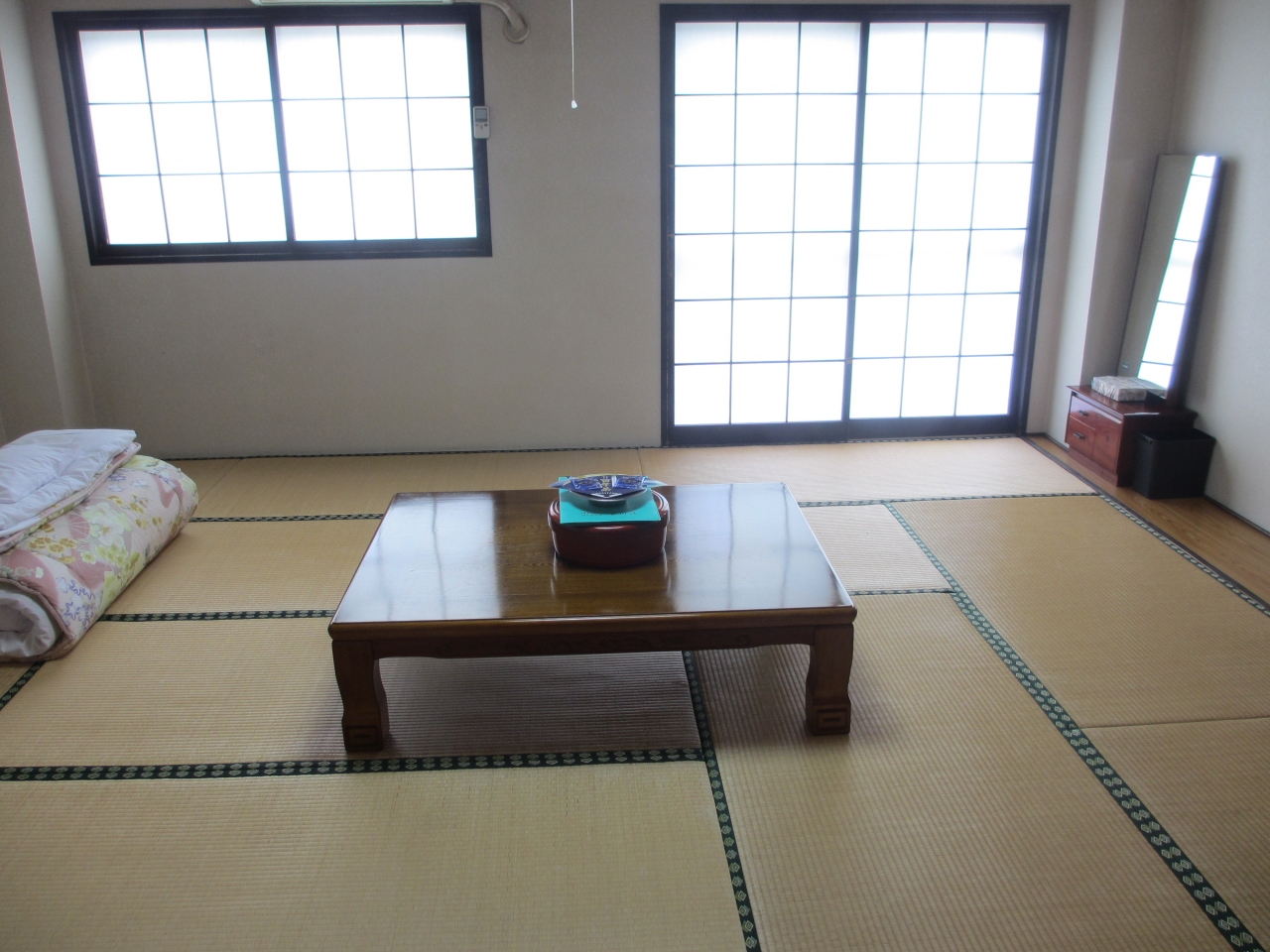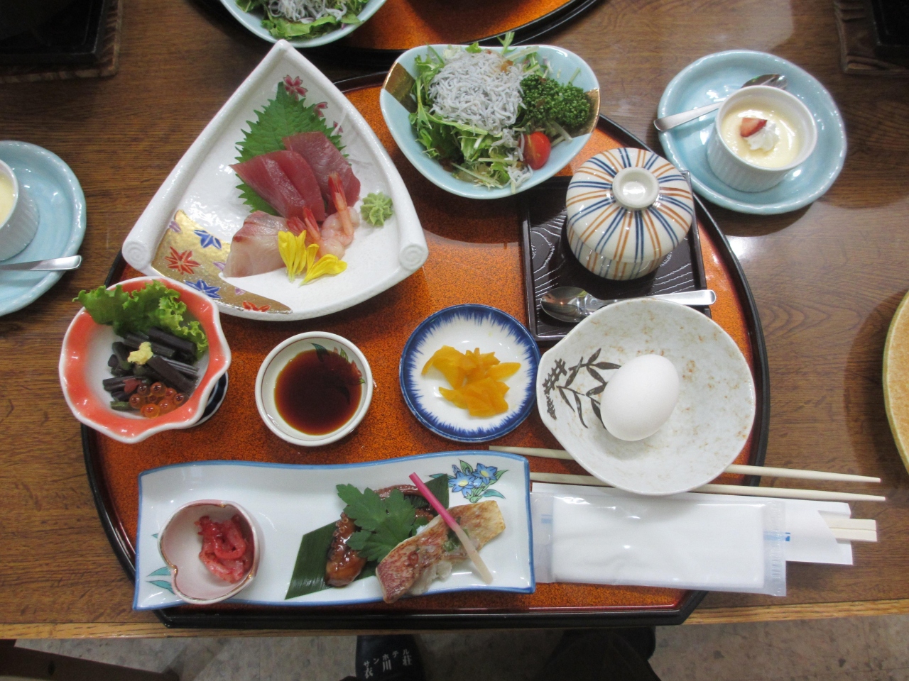 高台にあり眺望のよい部屋でした。畳んである布団を引っ張れば寝られるようにセットされてました。洗面台が2つあったので便利でした。予約したすき焼きの前沢牛は柔らかく甘みがありました。生卵の追加ができてすき焼きを美味しく食べました。朝食バイキングは和食・洋食が揃っていてサラダとフルーツがあり満足しました。