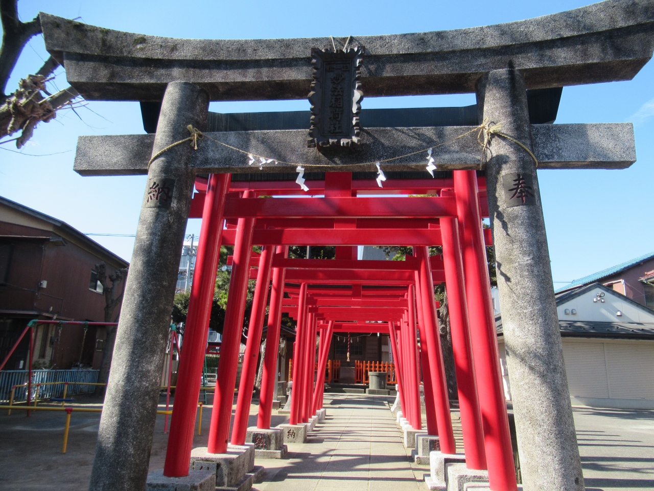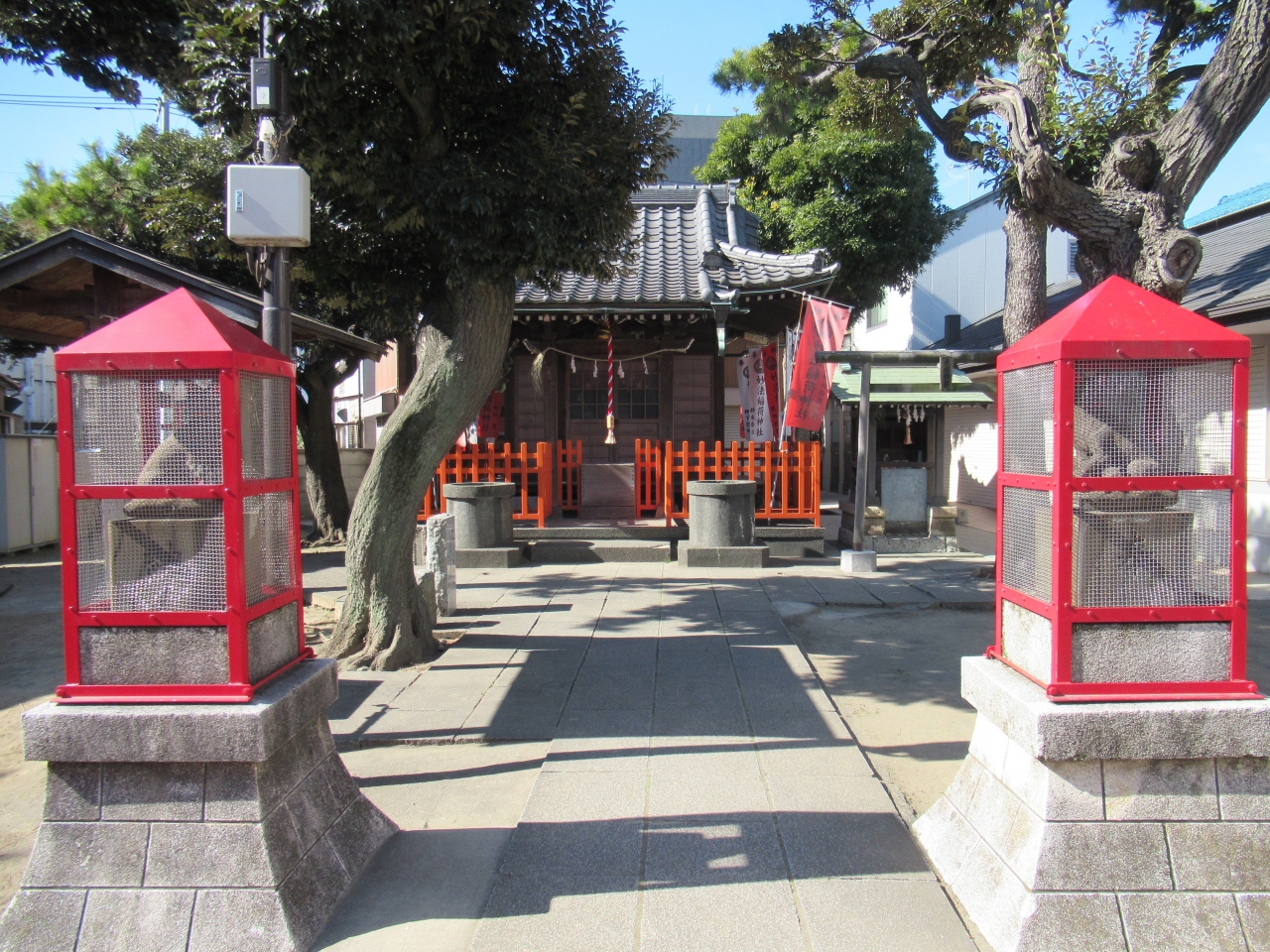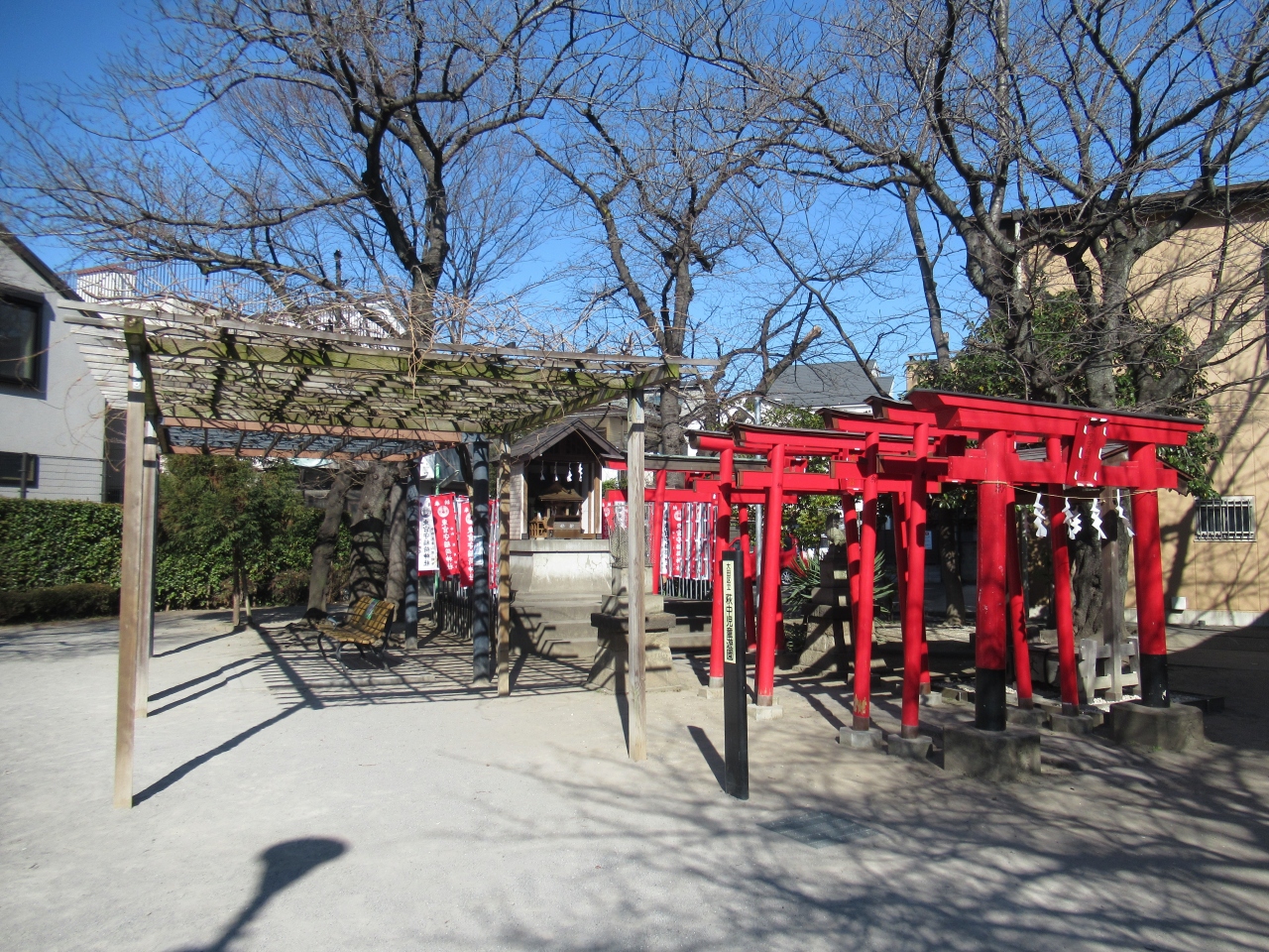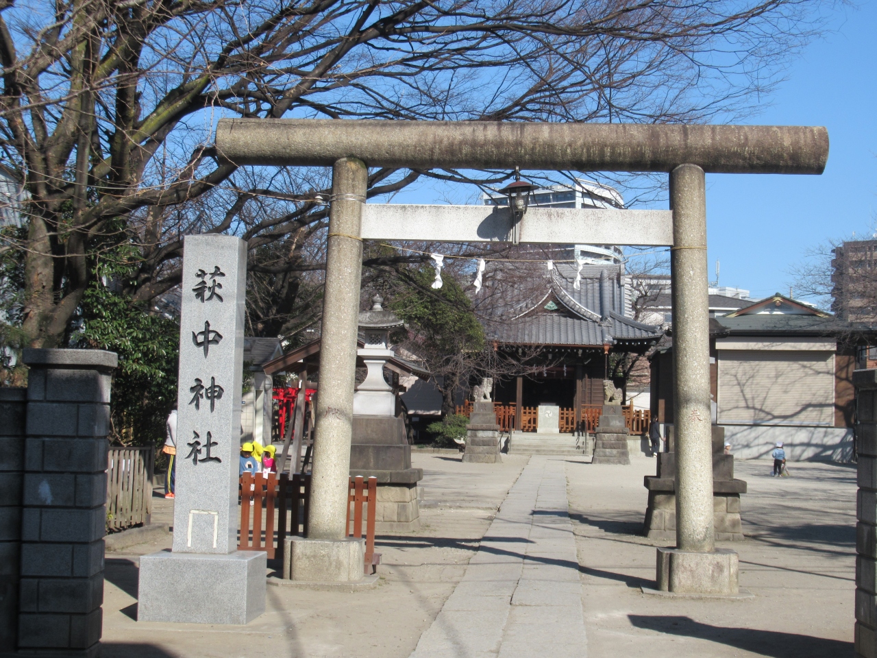 糀谷駅から南へ10分ほど歩いたところにあります。石造り鳥居のそばに力石が数個ありました。境内は広く木造社殿の奥に小さな萩中東官守稲荷神社が建っています。羽田七福いなりめぐりの一つで、赤い鳥居が並び、奉納された幟が社殿を囲んでいました。萩中神社と萩中東官守稲荷神社の間は萩中児童遊園になっていて、幼児用アスレチックすべり台があり、保育園児たちが遊んでいました。社殿前の広い境内で、別の保育園児たちがタコ遊びをして走り回っていました。帰りがけに保育士が園児と一緒に社殿に向かって手を合わせて、ありがとうございましたと言っていた様子に温かく感じました。昔から境内で子どもたちが遊んできたことを思い出しました。