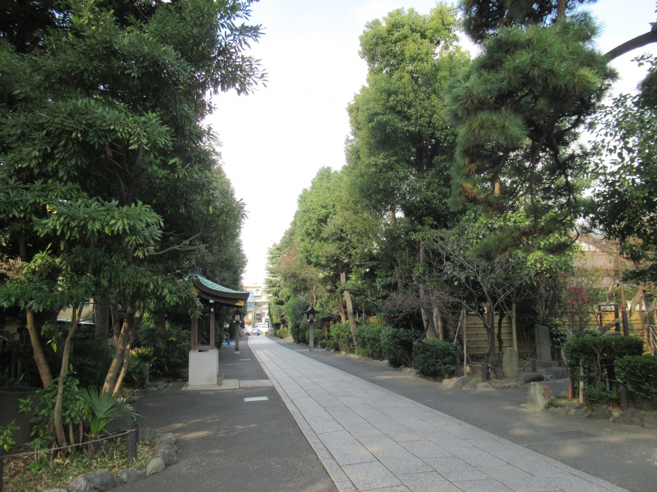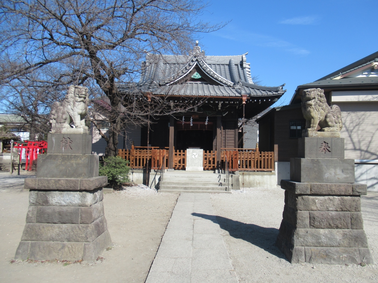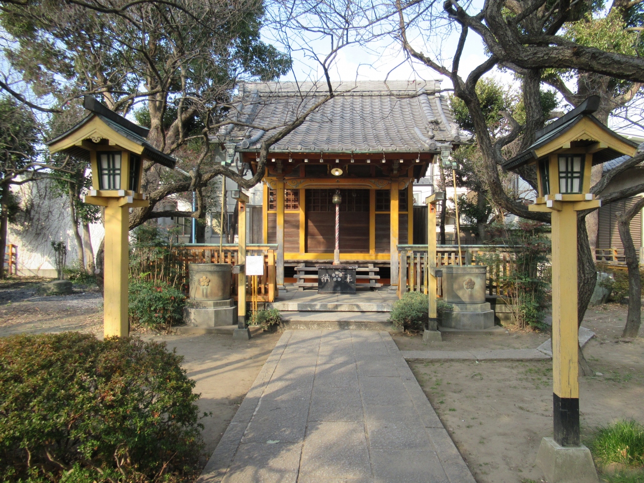 第一京浜沿い、六郷土手駅と雑色駅の中間あたりに建つ、1057年創建の広々とした静かな神社です。第一京浜から社務所までの100mほどの参道は木々が生い茂っています。もう一方の神社入口に建つ鳥居手前には、1191年に梶原景時が寄進したとされる太鼓橋が保存されています。橋の先に建つ木造の門と境内に建つ社殿は、堂々としていて落ち着きが感じられ、境内を神聖な雰囲気にしています。境内には1685年に奉納された阿吽の狛犬や、旧六郷橋に使われていた親柱なども保存されています。参道沿いには源頼朝が寄進したと伝わる手水石も残っています。長い歴史と厳かな雰囲気が感じられる神社です。