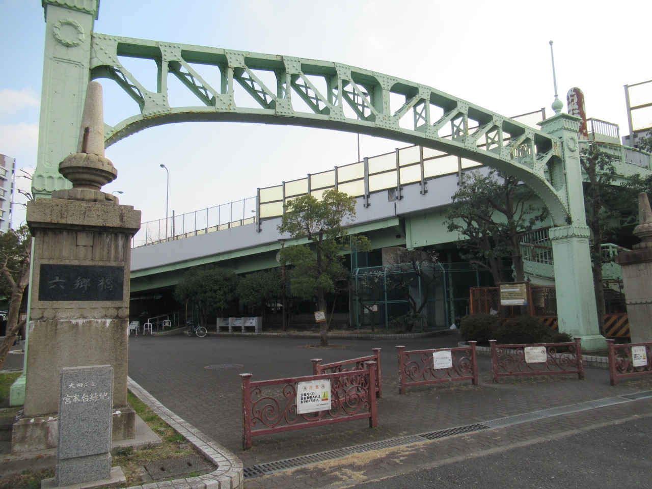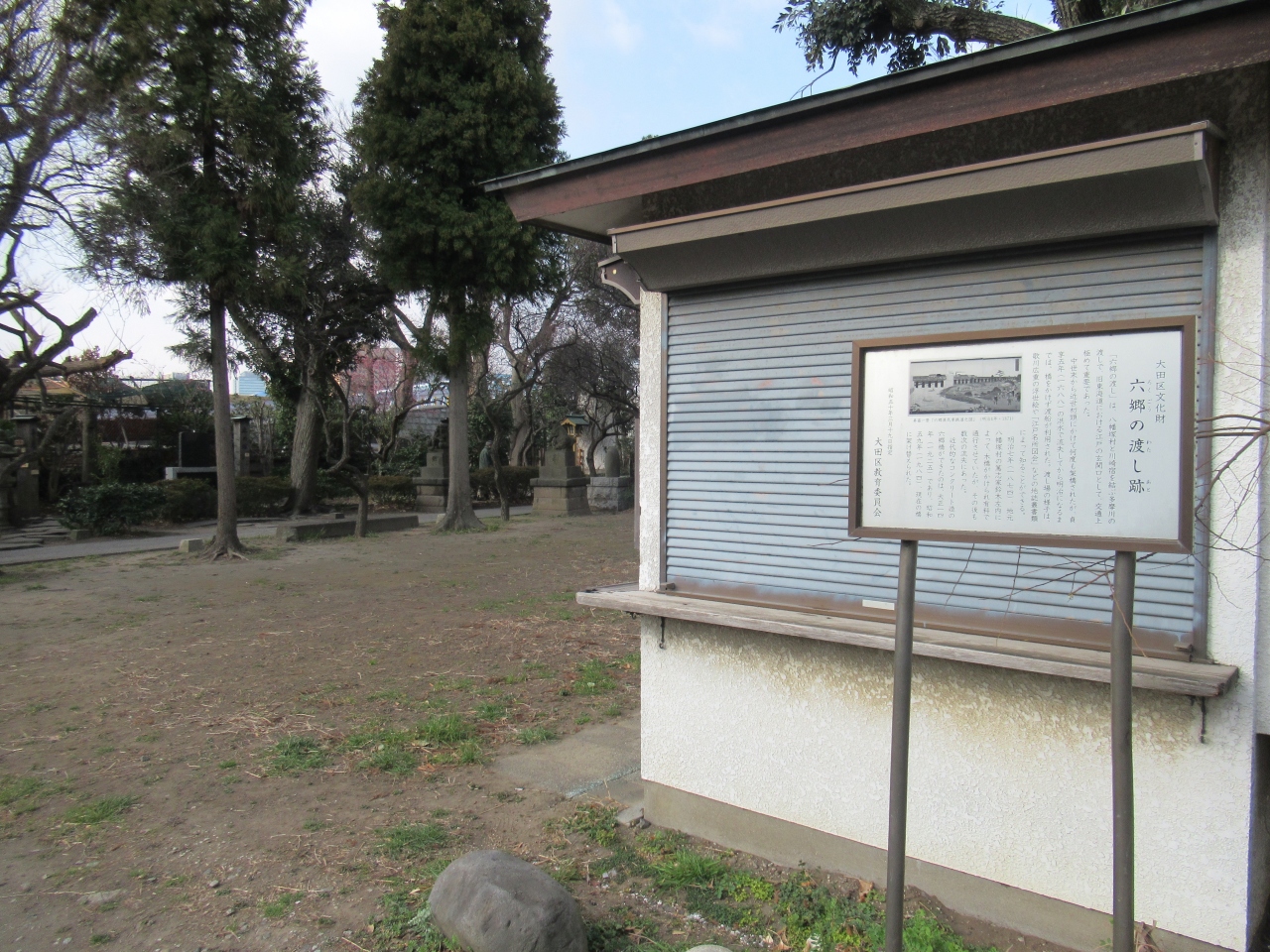 六郷土手駅から2分ほど、六郷橋に上がる階段の向かいに建つ、北野天神の鳥居右手の建物近くに説明板が立っています。説明板によると、参勤交代の要所だったため、徳川家康が1600年に橋を架けたものの、度重なる洪水で橋が流され、1688年以降は渡し船が主流となったそうです。その後、1925年にコンクリートの橋が架けられるまで利用されたとのことです。当時の歴史を知ることができる貴重な説明板です。