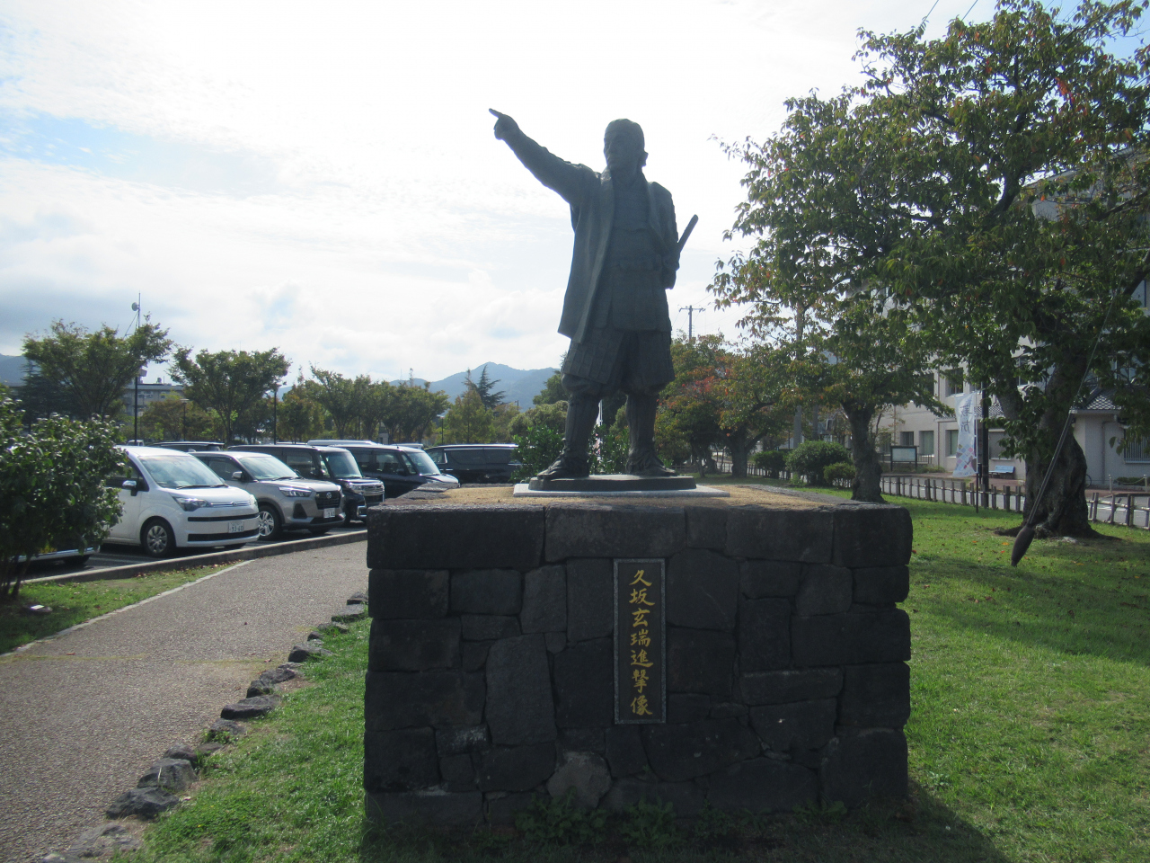 萩市中央公園の駐車場近くに久坂玄瑞進撃像があります。松下村塾の双璧と称され、尊王攘夷派を牽引して国事に奔走しました。その偉業を讃えるために2015年に建立されました。指先の方向へ動きだしそうな生き生きとした像です。