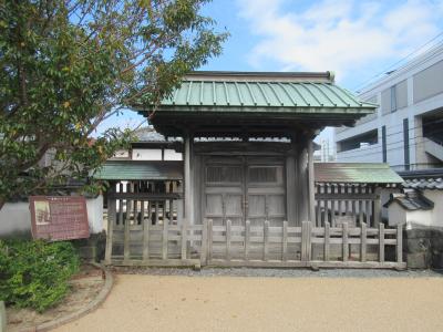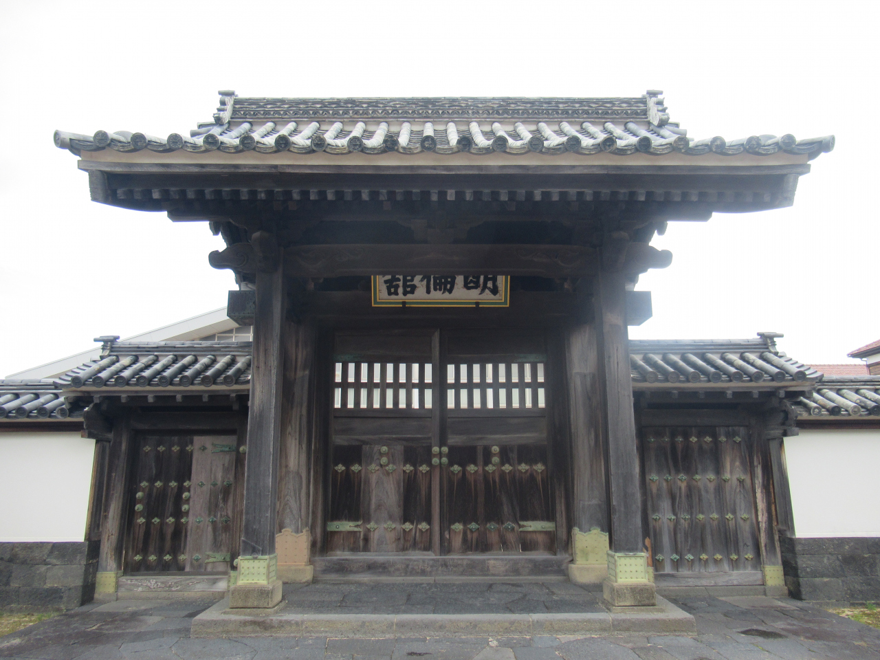 旧萩藩校明倫館時代からの遺構で、明倫学舎の南東側に建っています。屋根の両側に唐破風を備え、門の両側に格子の塀が設けられています。孔子を祀った聖廟の前門だったそうで、門は閉まっていて、普段開くことはないようです。