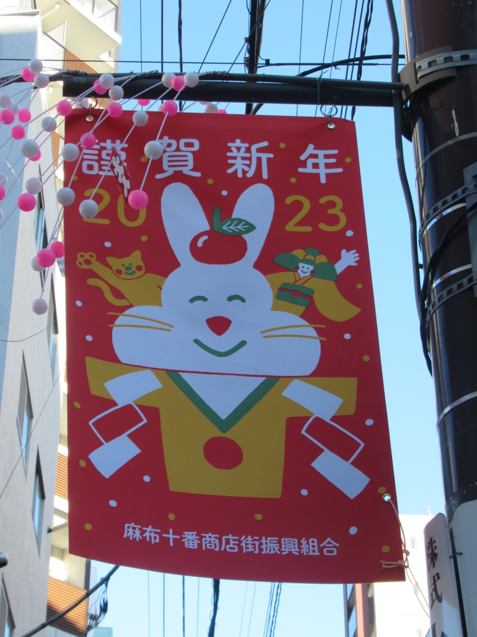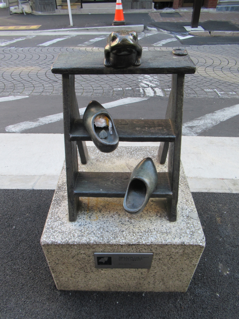 麻布十番駅4番出口から十番大通りを歩くと微笑みのモニュメントがところどころにあります。マニヴィア麻布十番の前にあります。小さなはしごに木靴と蛙がのっているほのぼのとしたモニュメントです。訪れた三が日の午前10時、十番大通りを歩く人は少なくモニュメントをじっくり見ることができました。木靴にごみが入っていて作品が台無しになっていました。人目のない年末年始に捨てたのでしょうか。静かな麻布十番散策でしたが、残念でした。