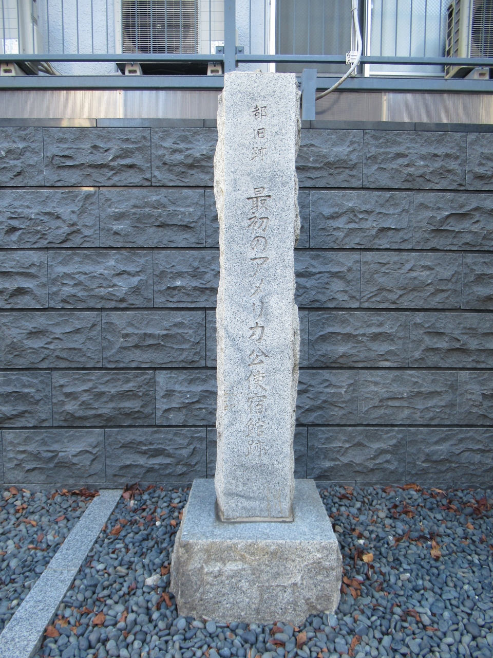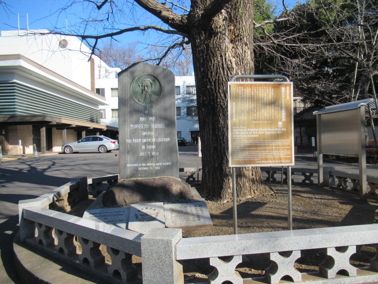 300年以上前、麻布十番は善福寺の門前町として発展した歴史があります。その善福寺の参道入口にアメリカ公使宿館跡と刻まれた碑が建っています。さらに善福寺境内には、1859年に下田にいたハリス総領事を公使に昇格させ、善福寺をアメリカ公使館として利用した記念碑が建っています。碑にはハリス氏の顔も描かれています。善福寺の歴史の一部を知ることができる2基の碑です。