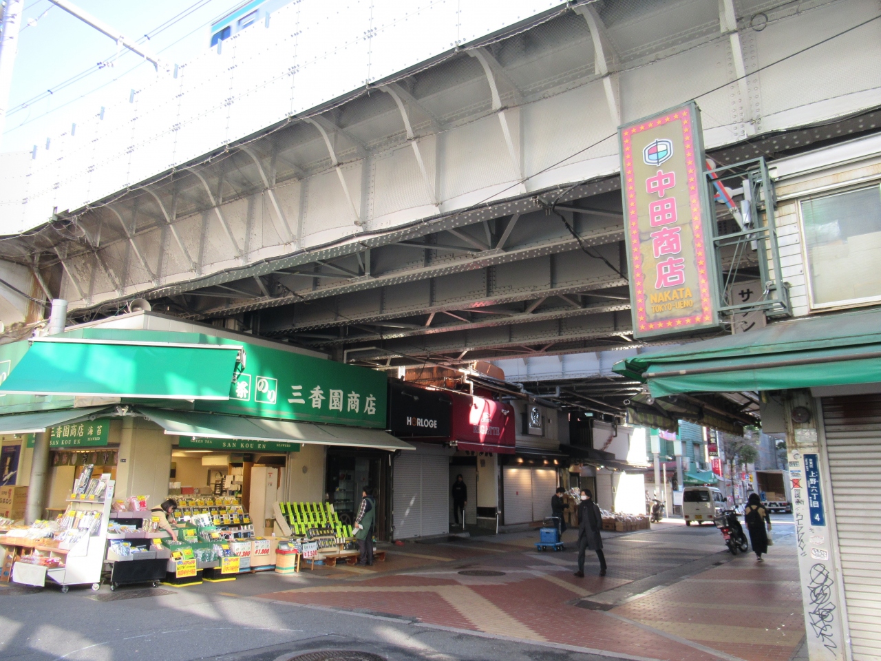 高架橋は観光施設ではありません。しかし東京駅と上野駅間の高架橋が完成したことで、100年近く前に山手線が環状運転されるようになり東京の近代化が進んだことを考えると、高架橋は貴重な歴史遺産と言えます。この高架橋もその一つで、御徒町駅側のアメ横商店街入口から70mほどのところに造られた40mほどの高架橋です。橋の下にはドライフルーツやバッグ、大学イモなどを売る店が出店していて、アメ横らしいにぎやかさが感じられました。