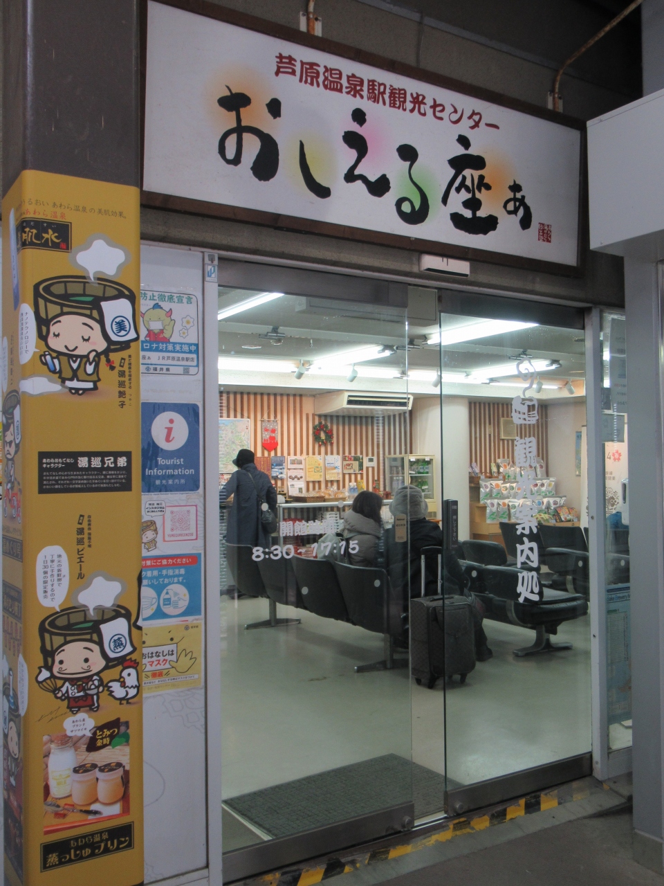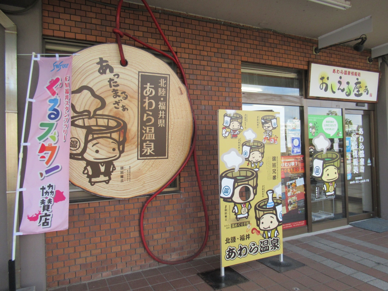JR芦原温泉駅とえちぜん鉄道あわら湯のまち駅に観光案内所おしえる座ぁがあります。JR芦原温泉駅のおしえる座ぁで、あわら湯のまち行きのバスについて聞いてあわら湯のまちへ行きました。あわら湯のまち駅のおしえる座ぁで街歩きマップや各施設の資料をもらいました。以前は駅構内にあわらの湯の案内所があったそうですが、十数年前に改装し現在の場所に観光案内所ができたことを教えてもらいました。あわら温泉は1883年に灌漑用水を掘っていたところ温泉が湧き出て、1884年に温泉宿が建ち、1912年に国鉄三国線が開通してから温泉郷として発展してきました。様々な旅館やホテルが営業している一方、会社の保養所として造られた建物が閉鎖していて、街歩きをしていると寂しい気分になりました。