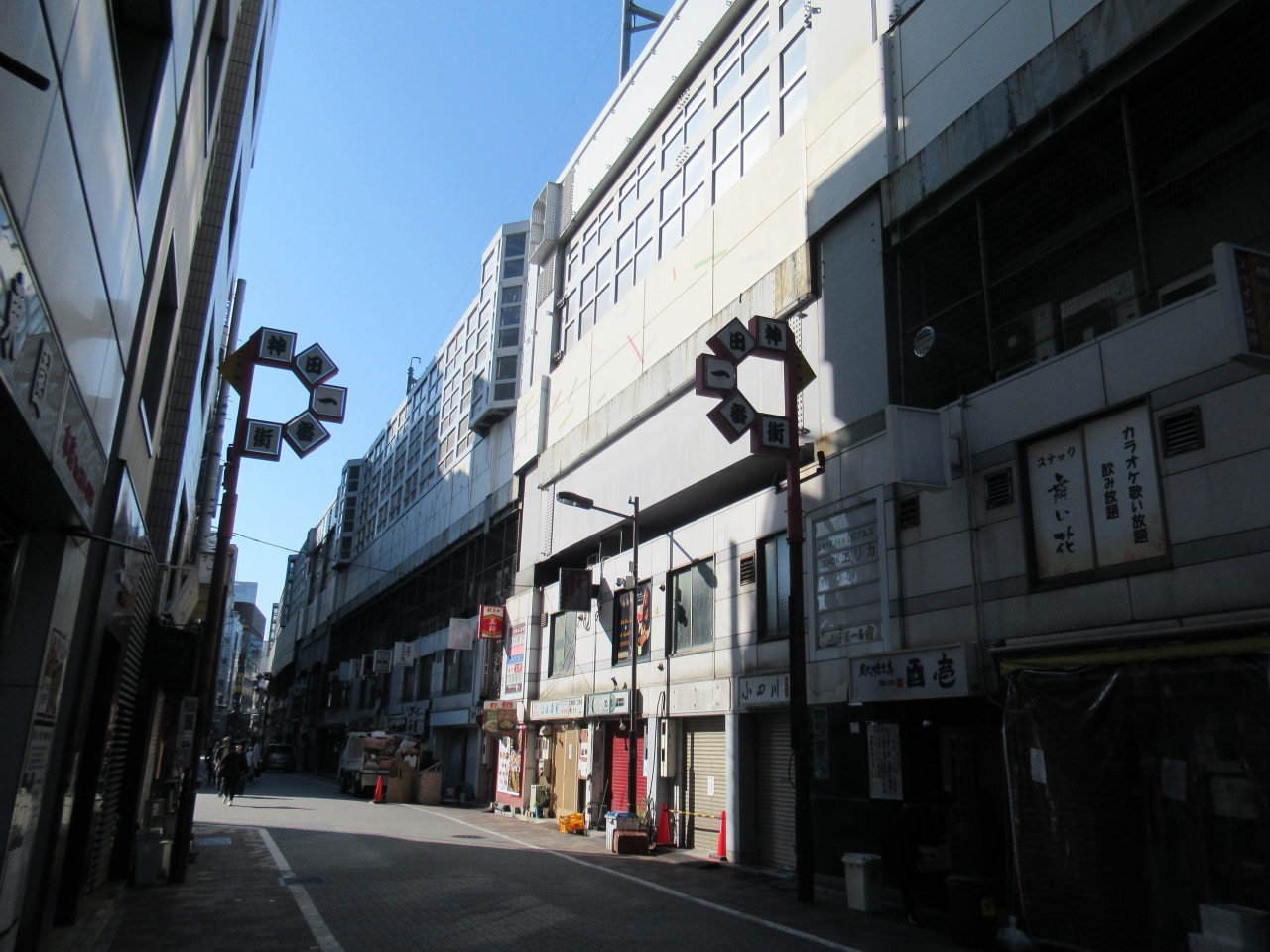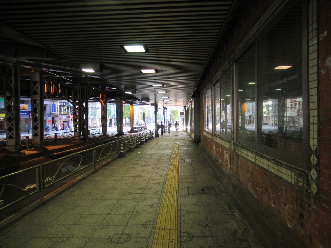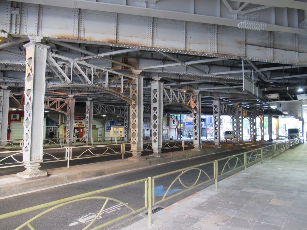 JR神田駅と秋葉原駅の間には多くの高架橋や架道橋が造られています。観光施設とは言えませんが、鉄道ファンや関心がある人には面白いスポットなのかもしれません。この高架橋もその一つで、神田駅北口前に造られている、幅が広い、しっかりした鉄柱で支えられている架道橋です。橋の下には飲み屋や床屋、格安チケット店、ブランド買取店などが並んでいます。反対側の壁のガラスケースには、神田駅100年の歴史展と銘打った、かつての神田周辺の街の様子を写した写真やまといのポスターなどが展示されていました。ガラスケースに水滴がたくさんついていてはっきり見えなかったのが残念でした。