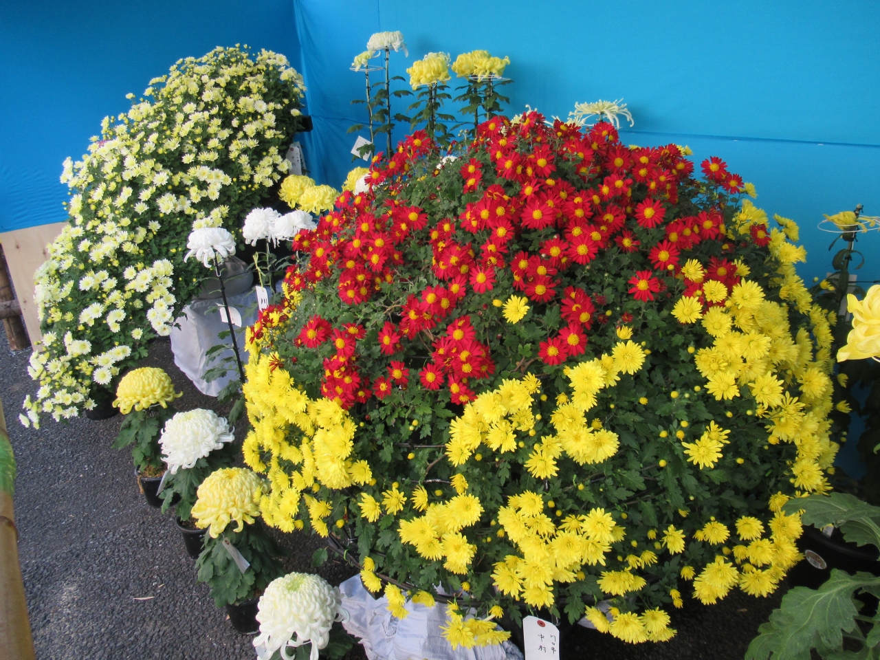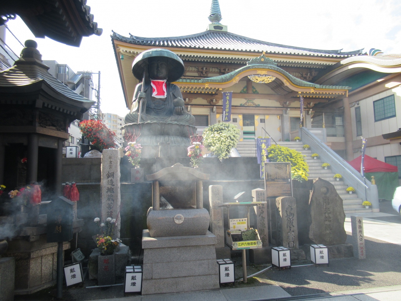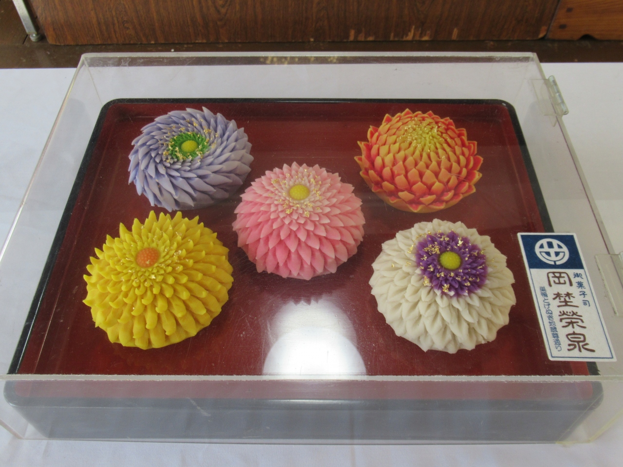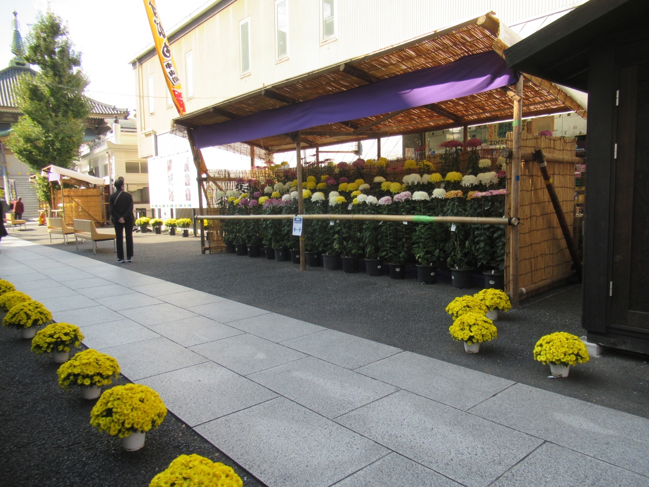 平日巣鴨地蔵通りで開催されているすがも菊まつりを見に行きました。巣鴨駅寄りの真性寺境内が会場の一つになっていました。参道両側に立派な菊が展示されていました。江戸六地蔵尊の横にも大きな菊の鉢が置かれ、本堂前の階段にも小菊の鉢が並べてありました。阿弥陀堂内に草月流生け花と大正大学書道部の展示会が開催されていました。奉納された和菓子店のみごとな菊の菓子に職人技を見ることができました。菊を観賞するための座りやすい長椅子が置かれていて、年輩者が座って休んでいました。歩き疲れた妻は座り心地がいいと気に入っていました。