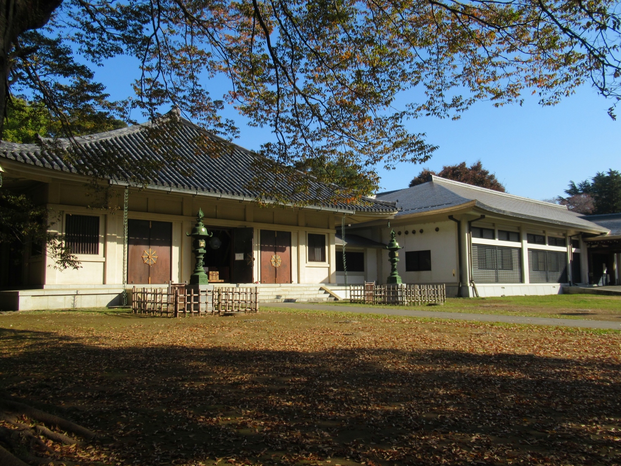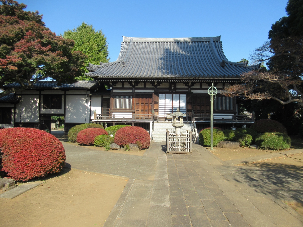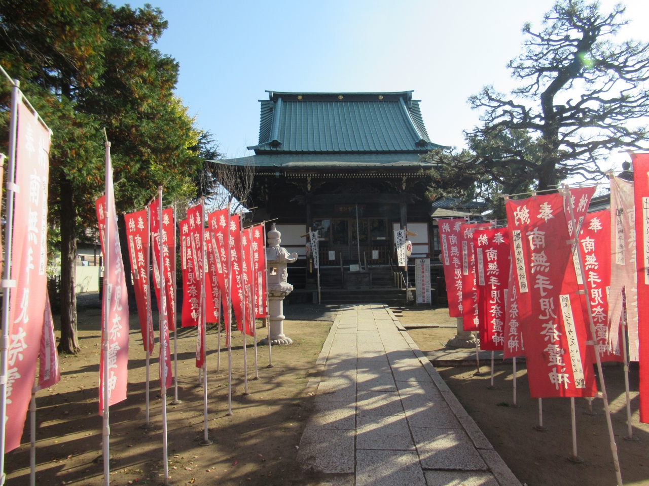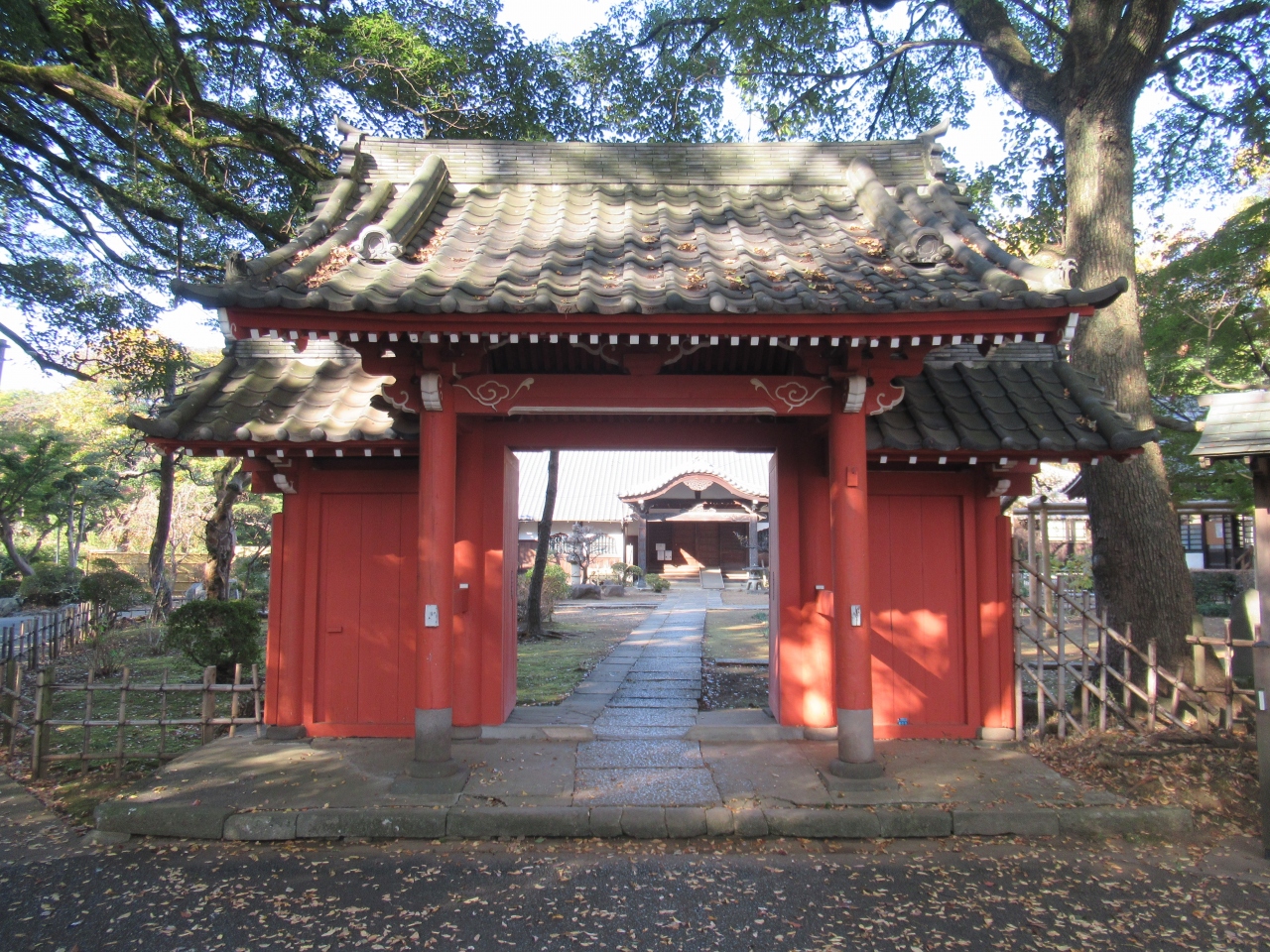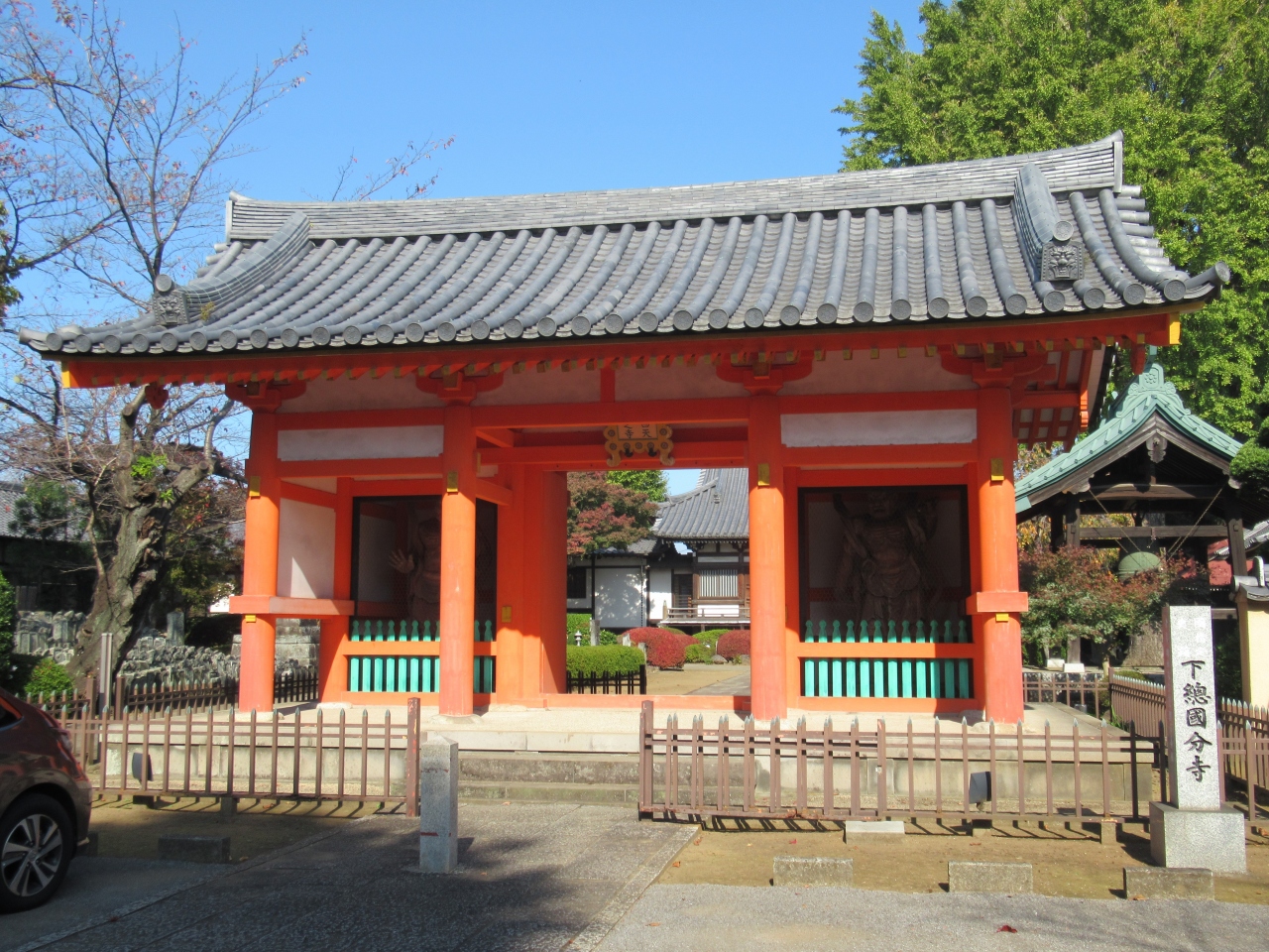 京成本線・国府台駅から12分ほど、大門通り(万葉の道)の突き当りに建つ、広々とした敷地を持つ日蓮宗の寺院です。奈良時代創建の寺で、江戸時代には徳川家康から寄進を受け、水戸光圀も訪れた寺です。山門から60段ほどの急な石段を上がった先には阿像と吽像が安置された仁王門と、境内には祖師堂、客殿、本堂が建ち、樹齢400年以上と伝わる伏姫桜も植えられています。本堂と道場の間には1888年の大火災にも焼失しなかった赤門が、道場近くには里見龍神堂や大黒堂などが建っています。仁王門をくぐった右手には鐘楼堂もあります。境内は緑が多く静かで、小鳥のさえずりがよく聞こえました。