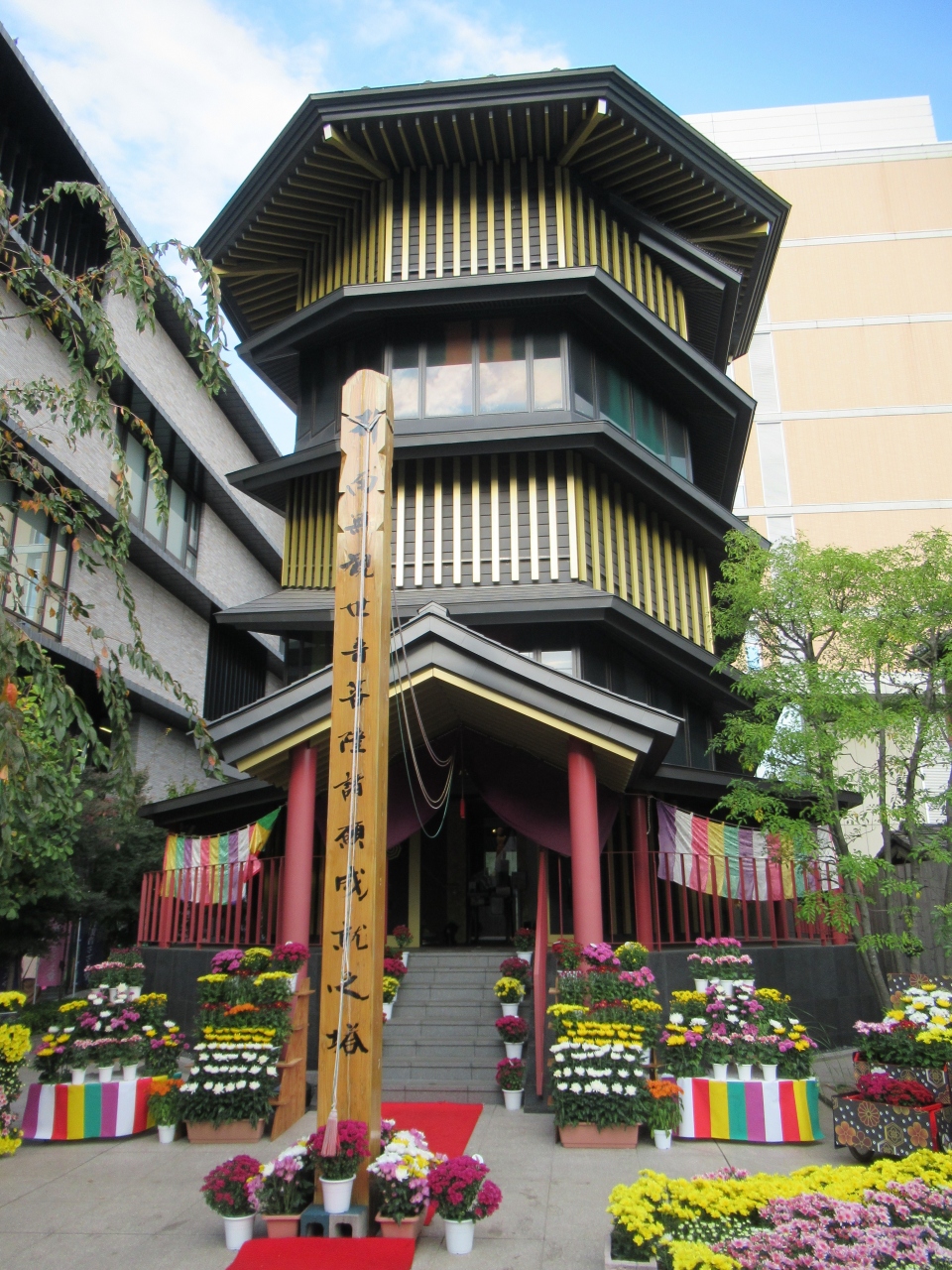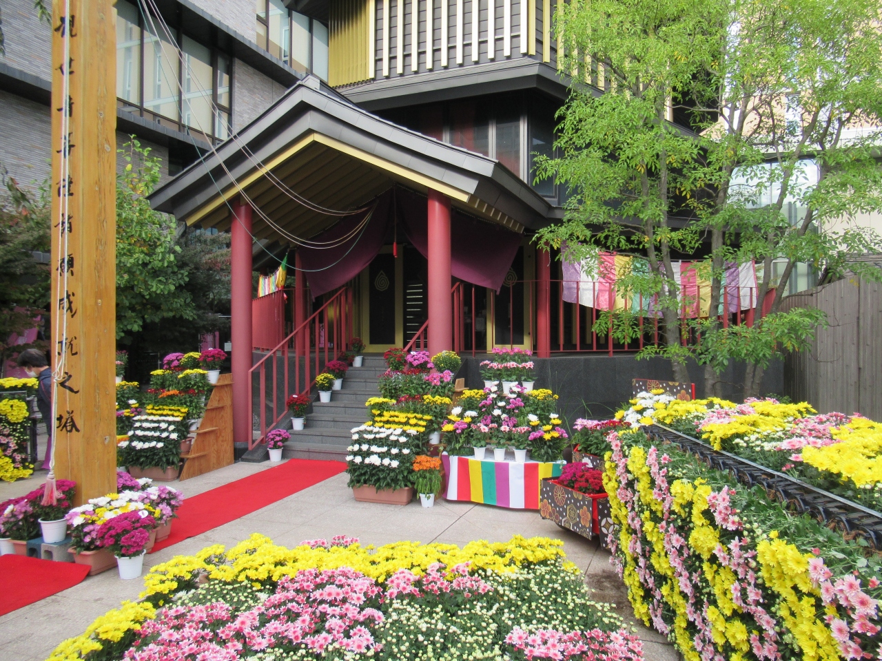 週末2日間、巣鴨で行われる新庄まつりの拠点となっていた大正大学を訪れました。商店街側の大学構内にすがも鴨台観音堂が建っています。10日ほど開催されるすがも菊まつりがすがも鴨台観音堂広場で行われていました。金茶と黒の観音堂前に明るい色の菊が飾られていて対比が美しかったです。大学構内とはいえオープンスペースなのでお詣りは自由にできます。新庄まつりを見に来て、山車巡行が始まる前にお詣りする人がいました。