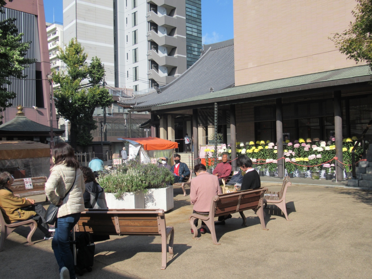 巣鴨地蔵通り商店街に建つ高岩寺と真性寺、大正大学のさざえ堂広場の3か所合同で行われた菊まつりに行ってきました。3カ所ともこじんまりした菊の展示で、とりわけ高岩寺は大輪が咲く鉢が40ほど置かれているだけでした。訪れていた人たちもわずかに菊に目を向けるだけで、すぐに立ち去っていました。まつりと名付けるには規模が小さすぎると感じました。