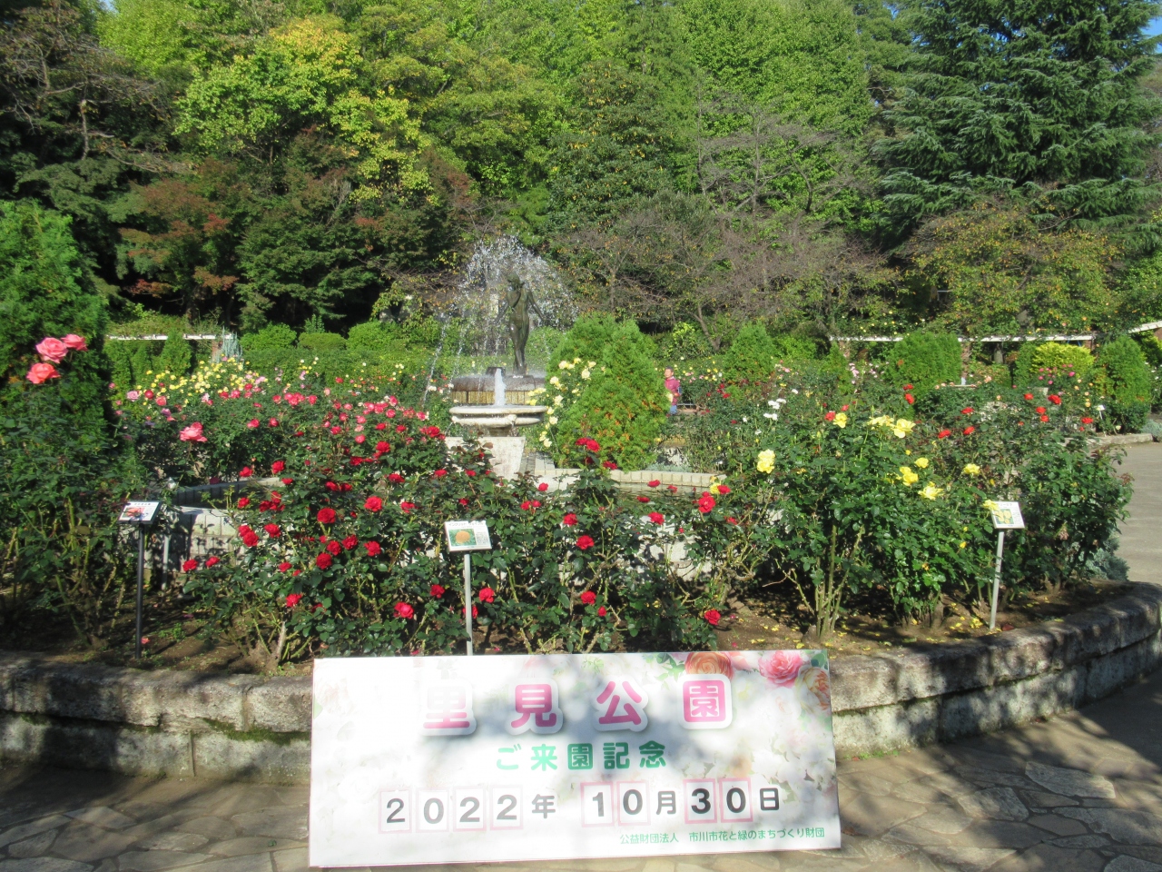 秋のバラが咲いている里見公園へ休日に車で行きました。江戸川沿いの駐車場は公園の西側にあり、北側の入口から里見公園に入りました。前方後円墳にあるむき出しの明戸古墳石棺、国府台城跡の石垣や空堀、1564年の北条氏との戦いで敗れた里見家の墓など、歴史を知ることができる史跡があります。里見公園正門近くは芝生広場やバラ園や児童遊園があり、バラを観賞する人たちや親子連れで賑わっていました。市川駅前に造られたバラ園から里見公園に移植されたバラが基となり、大切に育てられています。噴水の周りに咲くバラをベンチに座って眺めました。公園内の木々に名前と説明が記されたプレートがつけられているのも特徴です。駐車場へ向かう川沿いの道は狭いので歩行者と対向車への注意が必要でした。