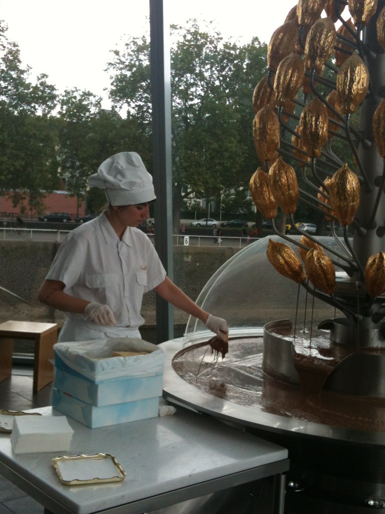 ライン川沿いにあります。ケルン中央駅(大聖堂側)から徒歩15~20分ほどです。川沿いの遊歩道を行くだけなので、迷うことはありません。中ではチョコレートの噴水があり、ひとり1つ噴水チョコをウエハースにつけたものを食べられます。(お姉さんが渡してくれるのであせらないように!(笑))展示内容は、チョコの歴史や、今なお販売されている、チョコレートの包み紙の変遷など。私は、スーパーに市販されているドイツチョコが好きなので、これは楽しかったです。カカオの木が生えている温室もありました。