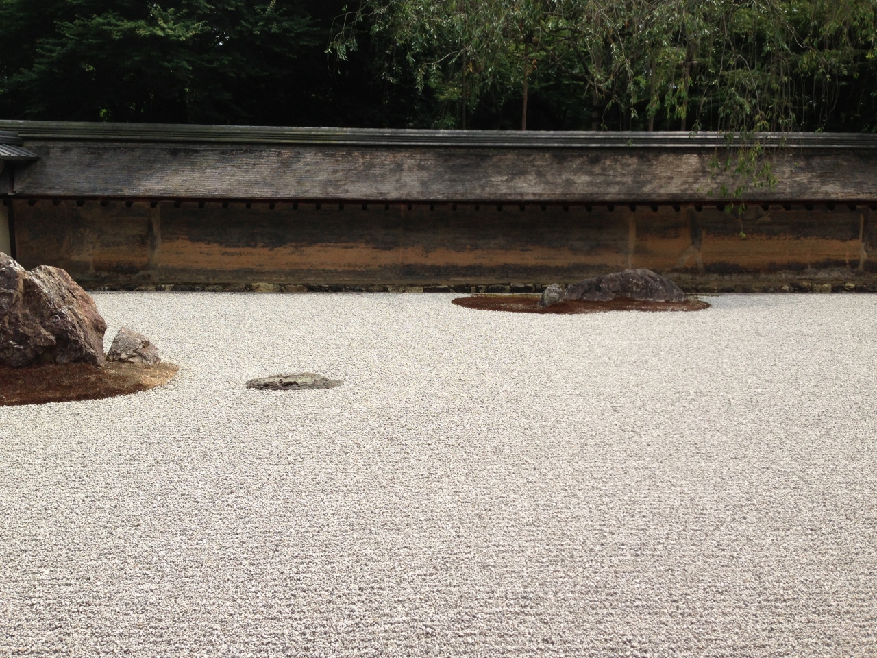 京都のお寺竜安寺♪の歌に魅せられて拝観してきました。今までに見たお寺の中で群を抜いて素晴らしかったです。お寺はそんなに大きくはありませんが、床に腰を下ろして15の石を心ゆくまで眺めていると、心地よい風がふっと吹き、それはそれは贅沢なひとときでした。外の池の周りは、緑がいっぱいで気持ちが良かったです。