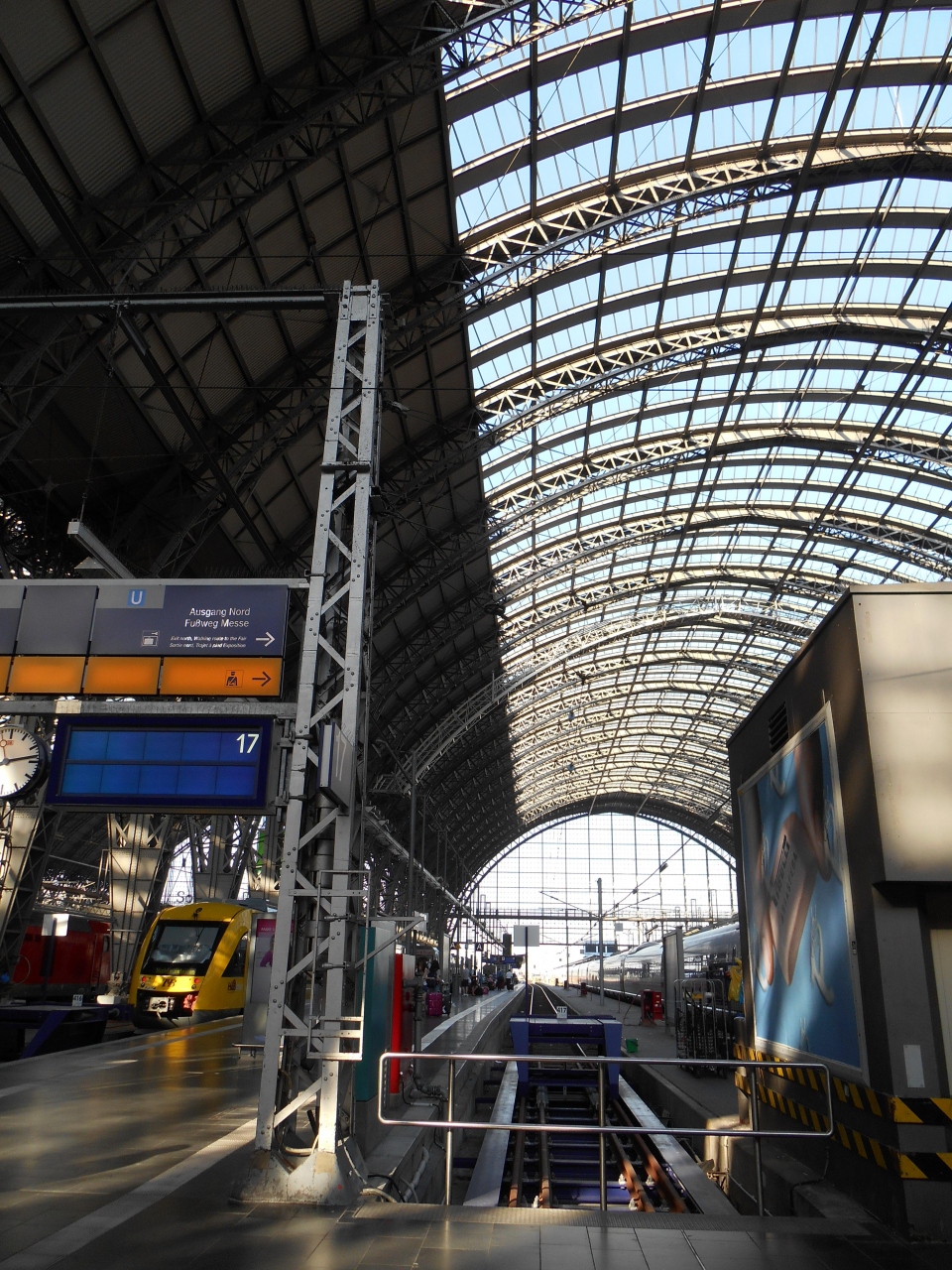 フランクフルト空港からS−BAHNで20分程度です。地上階はICE(都市間急行)とRB(中距離電車)のホームがあり、S-BAHNは地下2階にホームがあります。観光や空港に行く際に使う利用頻度の高いS-BAHNが地下にあり見つけにくいのが難点です。駅構内は軽食を売るスタンドがたくさんあります。