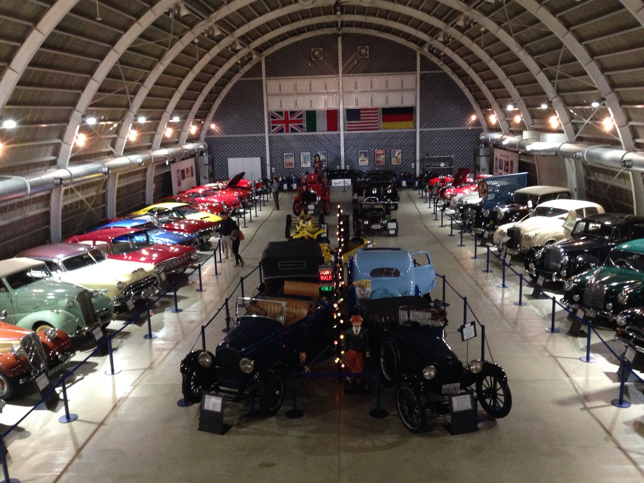倉庫(よりはしっかりとした長方形の建物)にズラーっと名だたる世界の車が並び、中央後ろにある4台ほどは実際に乗って写真を撮れます。